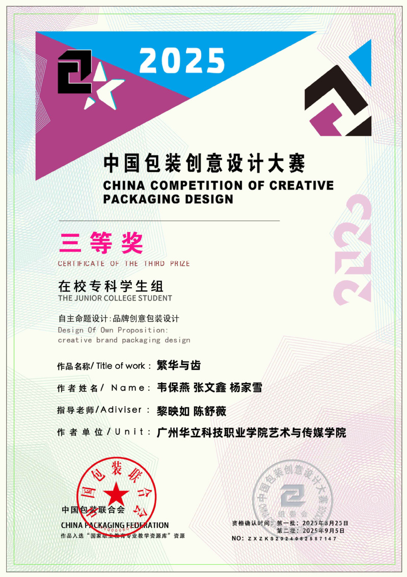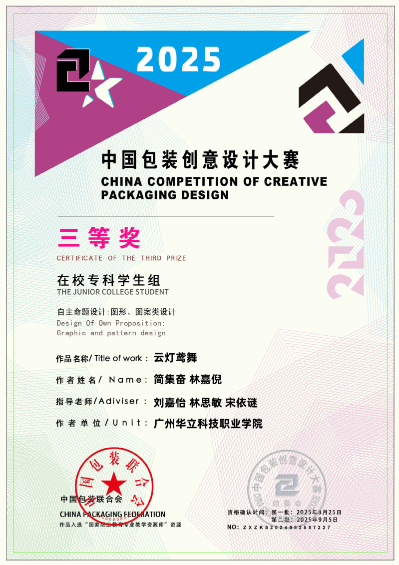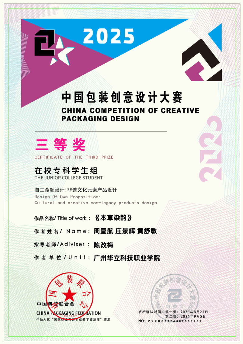 近日,2025中國包裝創(chuàng)意設計大賽獲獎名單正式公布,藝術與傳媒學院學生作品表現(xiàn)突出,作品《本草染韻》(作者:周壹航、 莊景輝、 黃舒敏,指導老師:陳改梅)榮獲全國三等獎;作品《山野珍饈》(作者:吳其晃,指導老師:黎映如、 陳舒薇)榮獲全國三等獎;作品《繁華與齒》(作者:韋保燕、 張文鑫、 楊家雪,指導老師:黎映如、 陳舒薇)榮獲全國三等獎;作品《云燈鳶舞》(作者:簡集奮、林嘉倪,指導老師:劉嘉怡、林思敏、宋依謎)榮獲全國三等獎;作品《匠心——茶葉農產品包裝設計》(作者:林燕津、梁嘉雯,指導老師:劉嘉怡、林思敏)榮獲全國三等獎。共斬獲國家級三等獎5項、優(yōu)秀獎6項,總計獲獎11項,充分展現(xiàn)了藝術與傳媒學院在設計教育與創(chuàng)新實踐方面的扎實成效。