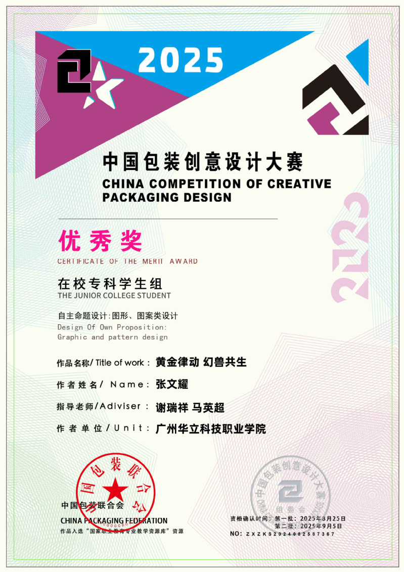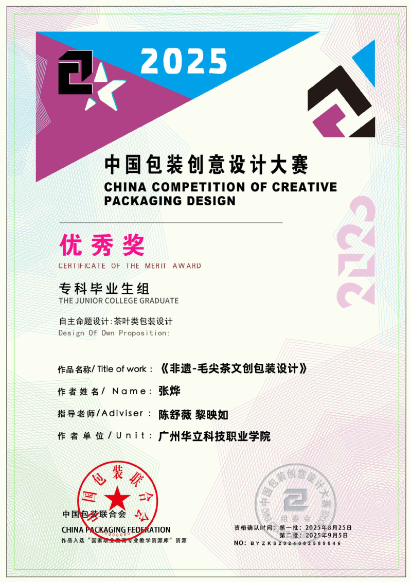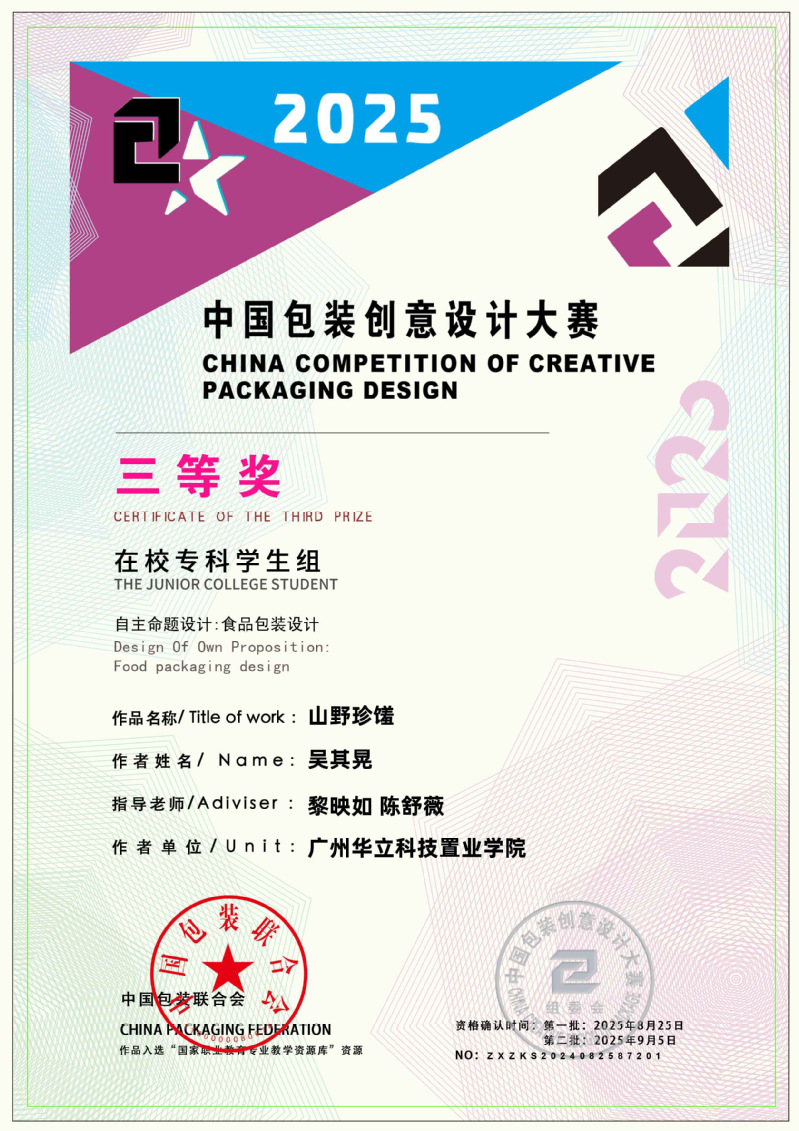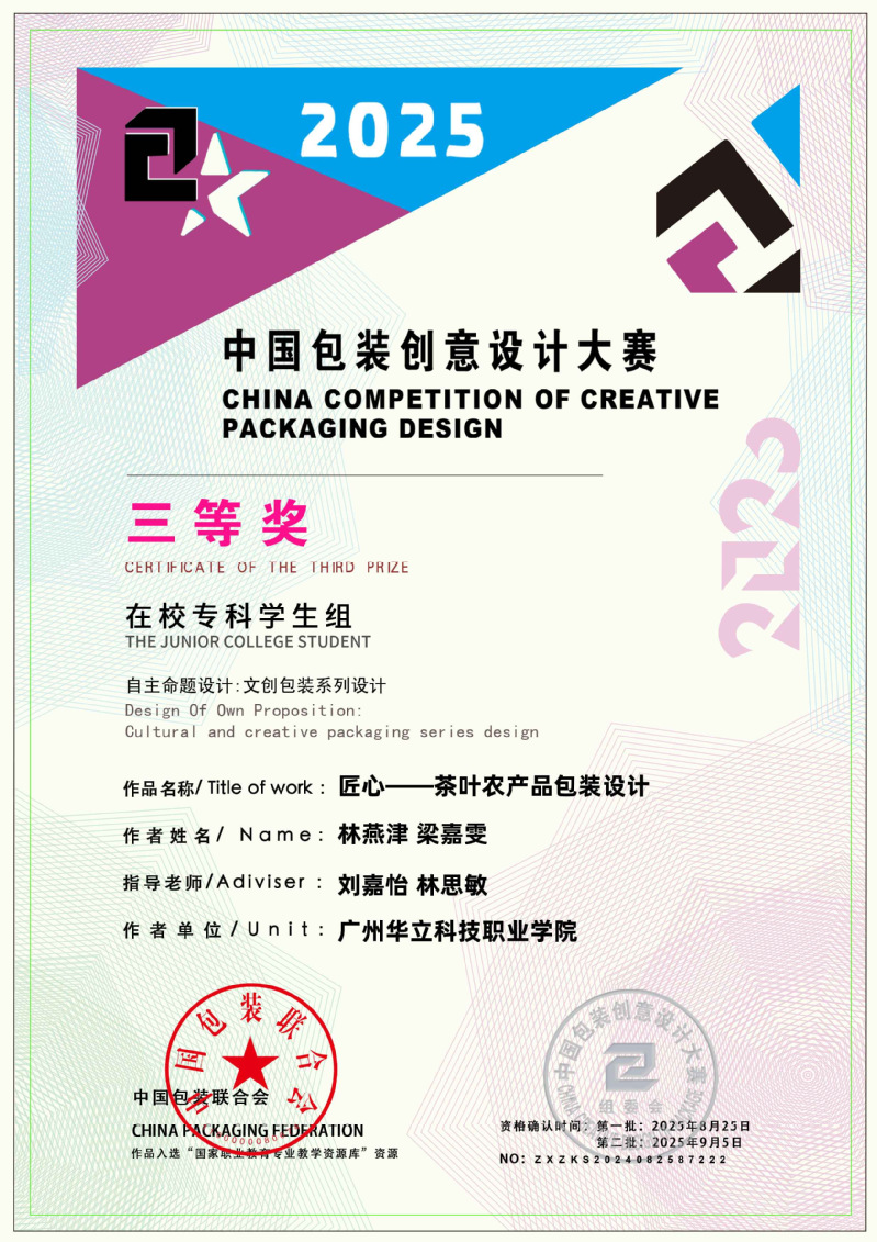 近日,2025中國包裝創(chuàng)意設計大賽獲獎名單正式公布,藝術與傳媒學院學生作品表現(xiàn)突出,作品《本草染韻》(作者:周壹航、 莊景輝、 黃舒敏,指導老師:陳改梅)榮獲全國三等獎;作品《山野珍饈》(作者:吳其晃,指導老師:黎映如、 陳舒薇)榮獲全國三等獎;作品《繁華與齒》(作者:韋保燕、 張文鑫、 楊家雪,指導老師:黎映如、 陳舒薇)榮獲全國三等獎;作品《云燈鳶舞》(作者:簡集奮、林嘉倪,指導老師:劉嘉怡、林思敏、宋依謎)榮獲全國三等獎;作品《匠心——茶葉農產品包裝設計》(作者:林燕津、梁嘉雯,指導老師:劉嘉怡、林思敏)榮獲全國三等獎。共斬獲國家級三等獎5項、優(yōu)秀獎6項,總計獲獎11項,充分展現(xiàn)了藝術與傳媒學院在設計教育與創(chuàng)新實踐方面的扎實成效。