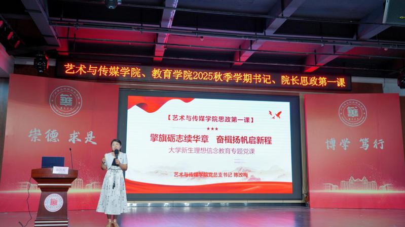 為引導和幫助青年學子學會用習近平新時代中國特色社會主義思想的先進理論武裝頭腦,將個人成長與民族復興緊密相連,扣好人生“第一??圩印?,9月11日晚,藝術與傳媒學院黨總支書記陳改梅老師以 “擎旗礪志續(xù)華章 奮楫揚帆啟新程”為主題,在圖書館八樓報告廳,為藝術與傳媒學院、教育學院新生帶來了情感觸動強烈、思想啟迪深刻的“思政第一課”。學院院長朱君、教師黨員和2025級新生參加聽課。