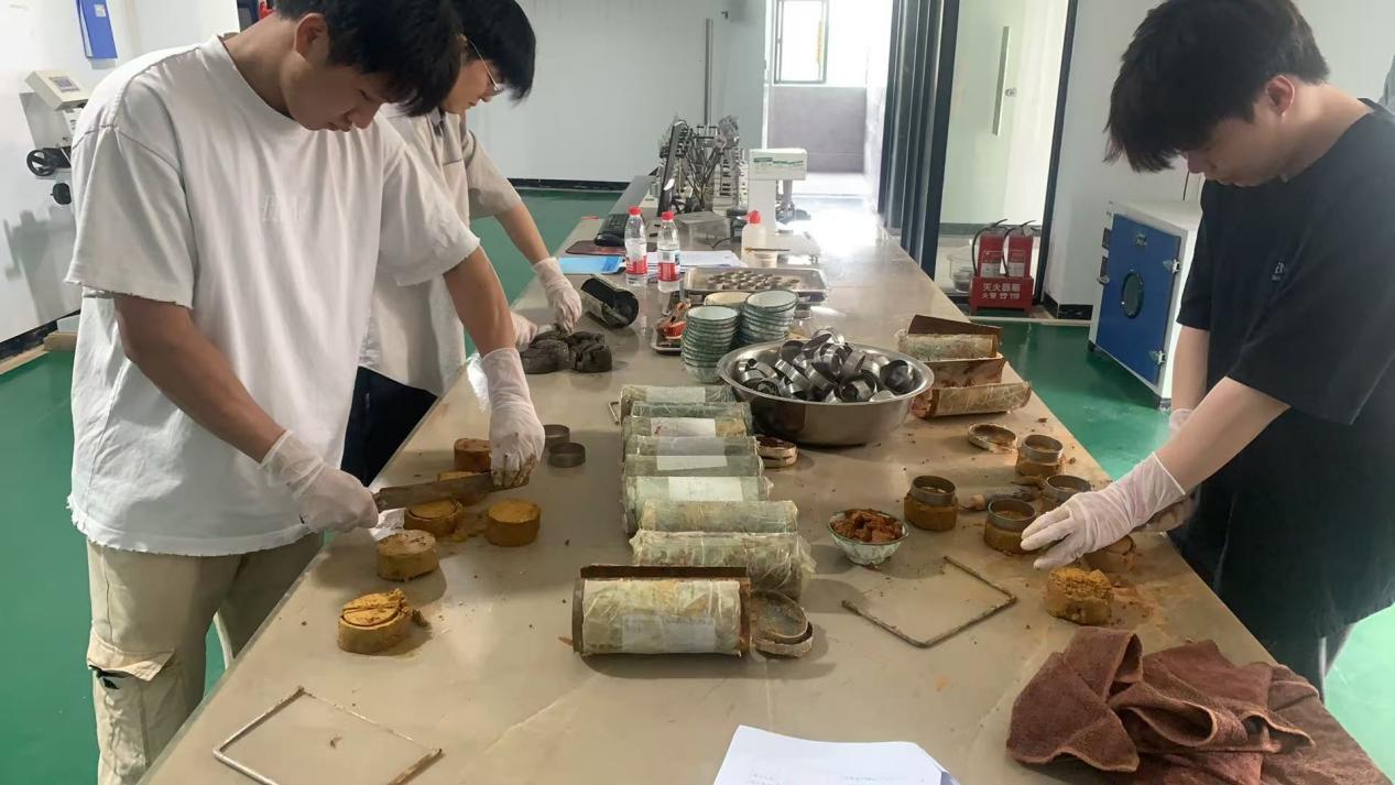 在公司技術(shù)人員的指導(dǎo)下,學(xué)生們系統(tǒng)學(xué)習(xí)及動(dòng)手實(shí)操包括土樣開(kāi)樣、密度試驗(yàn)、含水率試驗(yàn)、快速剪切試驗(yàn)、界限含水率試驗(yàn)(液塑限聯(lián)合測(cè)定法)、快速固結(jié)模試驗(yàn)及數(shù)據(jù)處理等七項(xiàng)重要土工試驗(yàn)內(nèi)容。每一項(xiàng)試驗(yàn)均為地質(zhì)工程勘察中的核心環(huán)節(jié),不僅對(duì)實(shí)驗(yàn)操作技能提出較高要求,也對(duì)數(shù)據(jù)分析能力和專(zhuān)業(yè)素養(yǎng)具有深刻檢驗(yàn)。