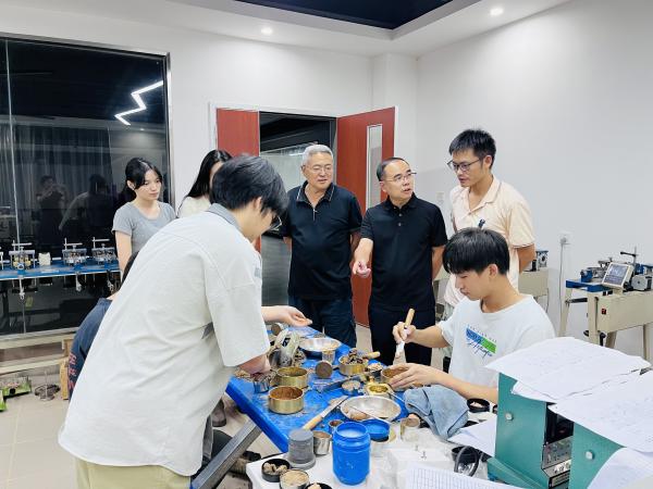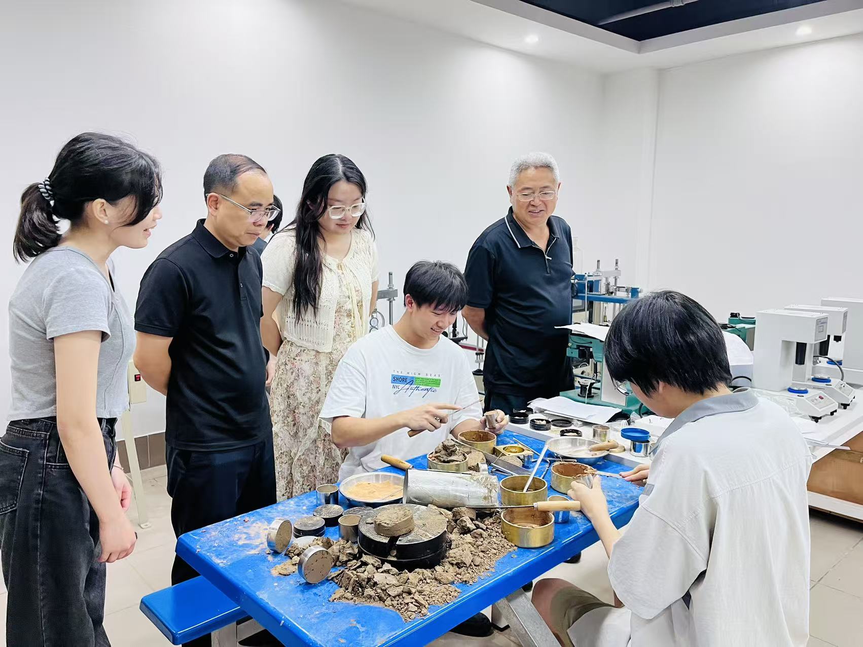 實踐操作是本次競賽的重要環(huán)節(jié),也是參賽學(xué)子們的重點備賽方向。三位學(xué)生在兩位老師的指導(dǎo)下,針對土工試驗?zāi)K中的多個關(guān)鍵項目展開專項訓(xùn)練,涵蓋土樣開樣、密度試驗、含水率試驗、界限含水率試驗(液塑限聯(lián)合測定法)、及數(shù)據(jù)處理等內(nèi)容。這些試驗均為地質(zhì)工程勘察的核心環(huán)節(jié),學(xué)生們認(rèn)真對待每一次試驗操作,從儀器設(shè)備的調(diào)試到樣本的采集與處理,再到數(shù)據(jù)的記錄與分析,每一個步驟都嚴(yán)謹(jǐn)細(xì)致,力求做到精益求精。