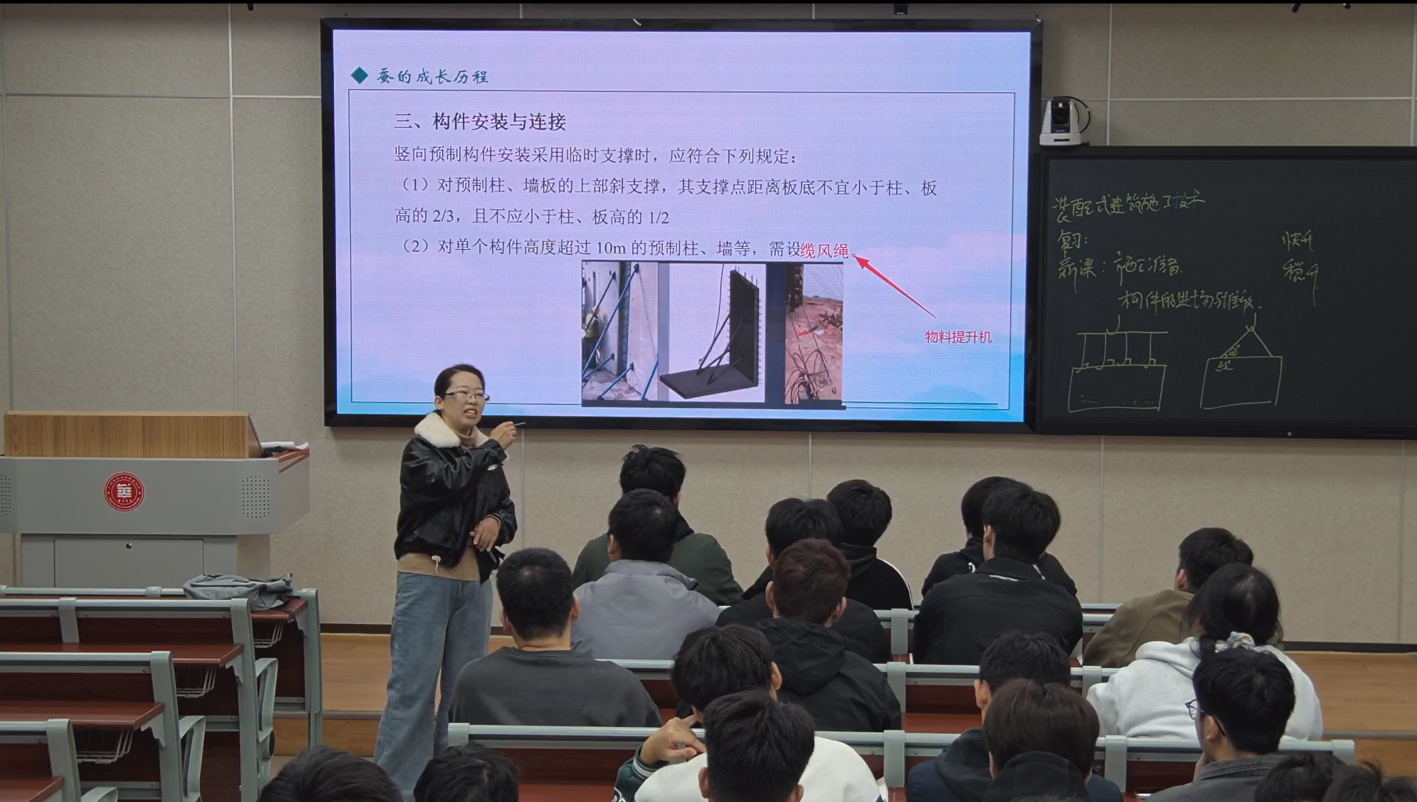 作為建筑行業(yè)轉(zhuǎn)型升級(jí)的重要方向,裝配式建筑以其高效、綠色、環(huán)保的優(yōu)勢(shì)成為行業(yè)發(fā)展主流,楊艷老師深耕裝配式建筑施工教學(xué)與科研領(lǐng)域多年,擁有豐富的理論積淀與實(shí)踐經(jīng)驗(yàn)。課程伊始,她以提問(wèn)互動(dòng)形式開(kāi)啟知識(shí)復(fù)習(xí)環(huán)節(jié),快速喚醒學(xué)生前期相關(guān)知識(shí)儲(chǔ)備,同時(shí)自然導(dǎo)入本次課程的核心主題,順暢完成新舊教學(xué)內(nèi)容的銜接過(guò)渡。隨后,結(jié)合國(guó)內(nèi)多個(gè)重大裝配式建筑工程案例,詳細(xì)拆解了構(gòu)件生產(chǎn)、運(yùn)輸、吊裝、節(jié)點(diǎn)連接等關(guān)鍵施工環(huán)節(jié)的技術(shù)要點(diǎn)與質(zhì)量控制標(biāo)準(zhǔn)。課堂上,楊艷老師還通過(guò)現(xiàn)場(chǎng)演示裝配式構(gòu)件拼裝模擬操作、互動(dòng)答疑等形式,調(diào)動(dòng)學(xué)生參與積極性,讓抽象的施工技術(shù)知識(shí)變得直觀易懂。