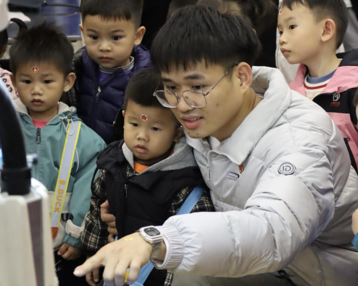 在科技樓5樓的科技館,劉杰老師帶著小朋友們了解無(wú)人機(jī)的分類(lèi)、作用以及操作原理。張寧波老師帶領(lǐng)小朋友們參觀了智能控制機(jī)器人,與孩子們互動(dòng)問(wèn)答,為孩子們科普了工業(yè)機(jī)器人技術(shù)知識(shí),讓孩子們近距離了解工業(yè)機(jī)器人的結(jié)構(gòu),對(duì)看似神秘的機(jī)器人工作原理有了啟蒙認(rèn)知。