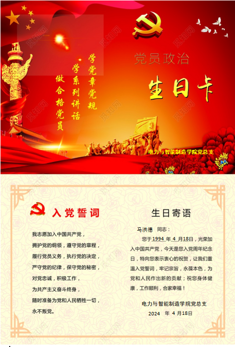 作為電力與智能制造學(xué)院教師黨員馬洪德,4月18日早上,收到了學(xué)院黨組織發(fā)的“政治生日”賀卡,心情特別興奮,1994年4月18日是我加入中國共產(chǎn)黨的日子。