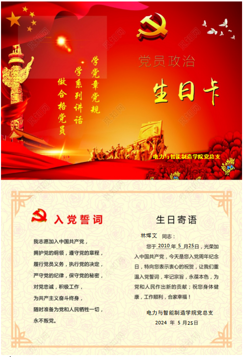作為電力與智能制造學院黨總支教師黨支部的一名教師黨員林輝文,5月25日早上,收到了學院黨組織發(fā)的“政治生日”賀卡,心情特別興奮,2010年5月25日是我加入中國共產(chǎn)黨的日子。