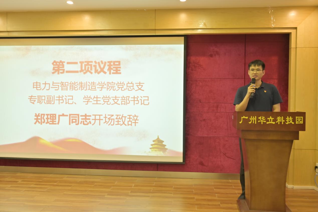 隨后,電力與智能制造學(xué)院黨總支專職副書記鄭理廣發(fā)表開場致詞,他對本次大會的順利召開表示熱烈的祝賀,并向新一屆全體學(xué)生干部的榮任表示祝賀。同時,鄭理廣書記對上一屆全體學(xué)生干部積極工作以及為學(xué)院所做出的貢獻表示衷心的感謝,他回顧了過去一年黨建小組在學(xué)院領(lǐng)導(dǎo)和老師的支持下取得的顯著發(fā)展,并強調(diào)換屆是新的起點,希望新一屆團隊不忘初心,砥礪前行,引領(lǐng)黨建取得更大成就,為學(xué)校發(fā)展貢獻青春力量。