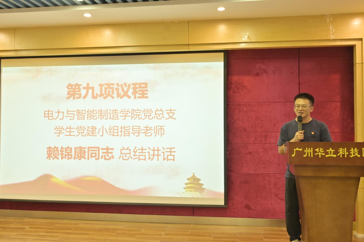 最后,電力學(xué)院學(xué)生黨支部組織委員、學(xué)生黨建小組指導(dǎo)老師賴錦康進行總結(jié)講話。他強調(diào)電力學(xué)院學(xué)生黨建小組成功舉行第七屆換屆大會,彰顯了年輕干部的活力與擔(dān)當(dāng)。他回顧了第七屆小組在學(xué)校的領(lǐng)導(dǎo)下圓滿完成任務(wù),實現(xiàn)了創(chuàng)新突破,并對上屆黨建小組成員的付出表示了感謝。同時,他對第八屆黨建小組成員寄予厚望,期待他們繼承傳統(tǒng),發(fā)揚優(yōu)勢,以德才兼?zhèn)?、謙虛友善、銳意創(chuàng)新為準則,為學(xué)院黨建小組的發(fā)展做出更大貢獻。