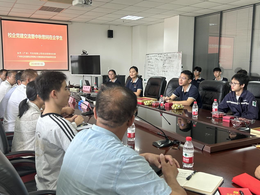 學(xué)院教師黨支部與北汽(廣州)汽車(chē)有限公司綜合管理黨支部是黨建結(jié)對(duì)共建單位。在中秋佳節(jié)到來(lái)之際,9月13日上午,學(xué)院教師黨支部書(shū)記孫令真帶領(lǐng)學(xué)院沒(méi)有課的8位黨員教師,到北汽(廣州)汽車(chē)有限公司進(jìn)行黨建交流學(xué)習(xí)和中秋慰問(wèn)在企學(xué)生。學(xué)院黨總支書(shū)記褚玉峰,北汽(廣州)汽車(chē)有限公司綜合管理黨支部副書(shū)記黃建安、人力運(yùn)營(yíng)經(jīng)理李婷婷、人事員陳晶及我校在企學(xué)生代表參加了會(huì)議。