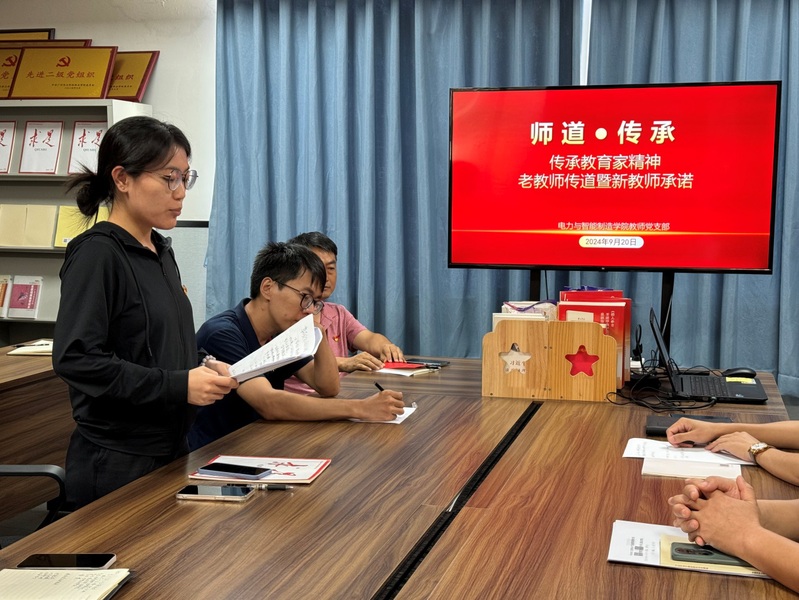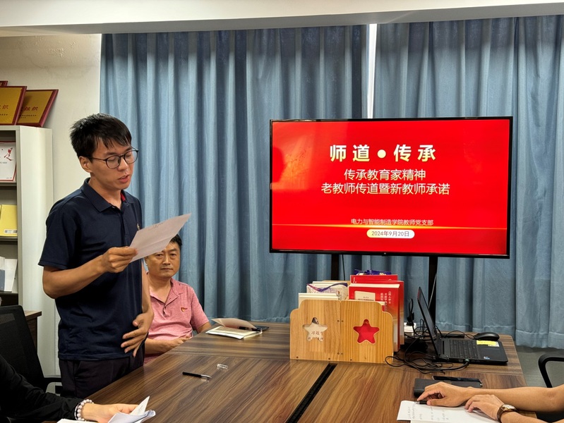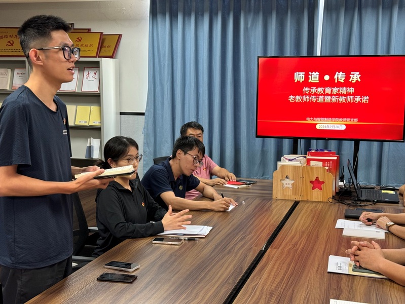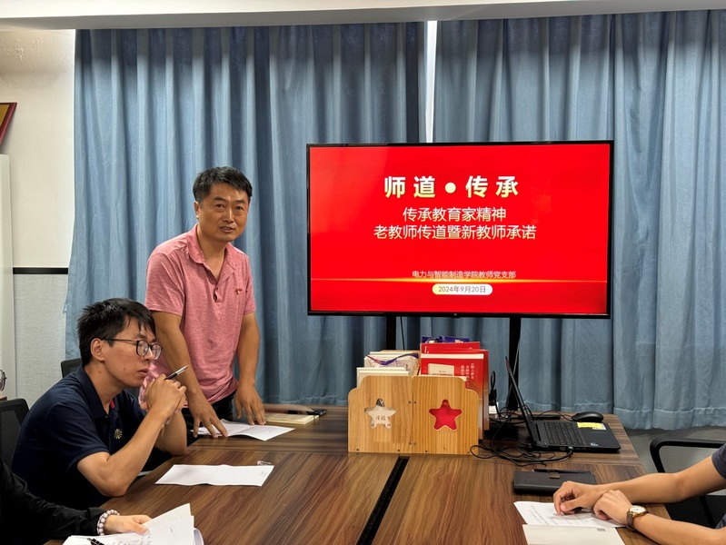 為了學(xué)習(xí)貫徹黨的二十屆三中全會(huì)精神,大力弘揚(yáng)教育家精神,加快建設(shè)教育強(qiáng)國(guó),9月20日下午在西1-514A會(huì)議室,電力與智能制造學(xué)院教師黨支部組織召開(kāi)全體教師大會(huì),開(kāi)展“師道傳承”——老教師傳道暨新教師承諾活動(dòng),學(xué)院黨總支書記、院長(zhǎng)褚玉峰及全體教師參加了會(huì)議,會(huì)議由教師黨支部書記孫令真主持。