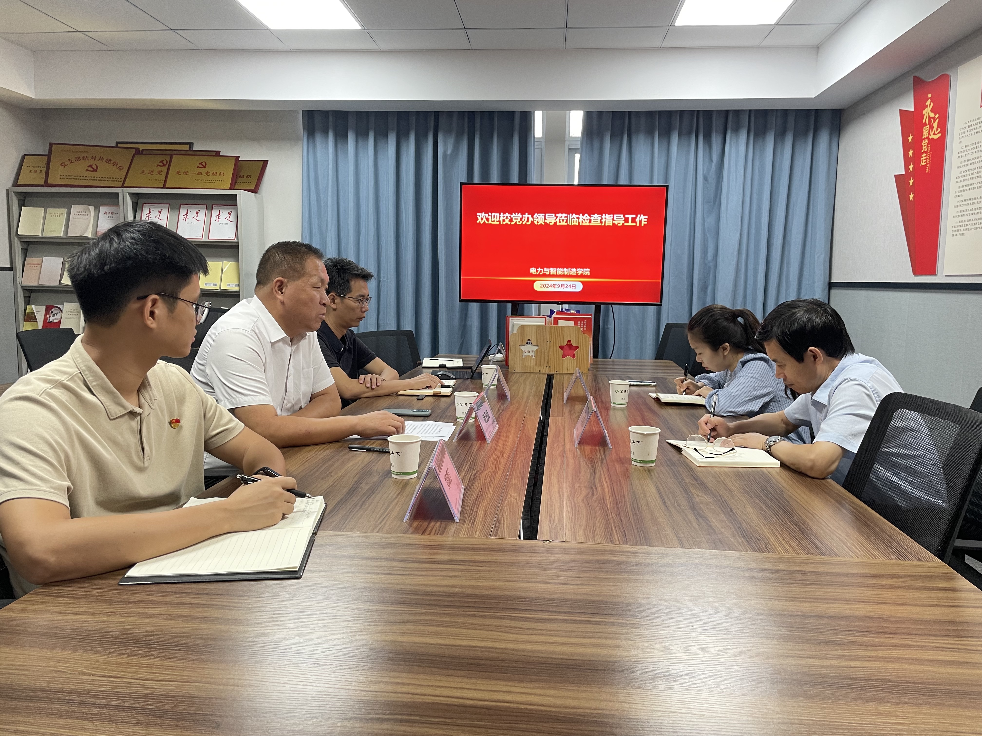 9月24日上午,學(xué)校黨委辦公室主任石朝陽帶領(lǐng)黨委組織部副部長陳曉薇,來到電力與智能制造學(xué)院檢查和指導(dǎo)黨建工作,學(xué)院黨總支委員參加調(diào)研座談會(huì)。會(huì)議由學(xué)院黨總支書記、院長褚玉峰主持。