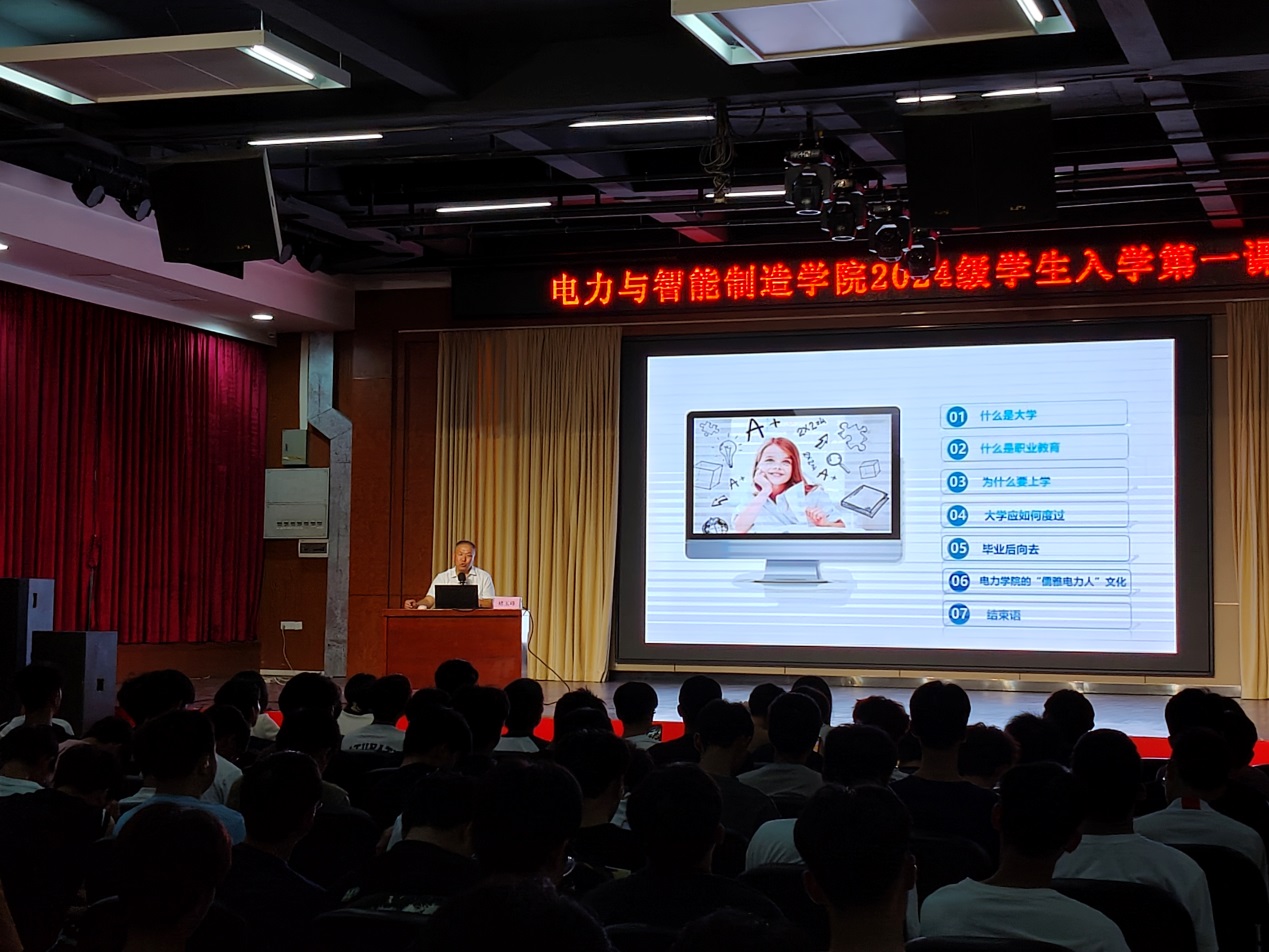 學(xué)院黨總支書記、院長褚玉峰,結(jié)合自己的成長經(jīng)歷給新同學(xué)們分享了:什么是大學(xué)、什么是職業(yè)教育、為什么要上大學(xué)、大學(xué)應(yīng)如何度過、畢業(yè)后去向,“儒雅電力人”文化等方面內(nèi)容。