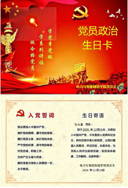 作為電力與智能制造學(xué)院黨總支教師黨支部的一名教師黨員孫令真,12月24日早上收到了學(xué)院黨組織發(fā)的“政治生日”賀卡,心情特別興奮,2008年12月24日是我加入中國(guó)共產(chǎn)黨的日子。