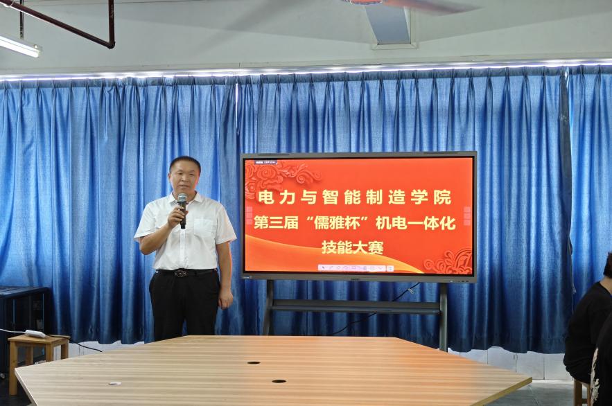 學(xué)院黨總支書記、副院長褚玉峰致開幕詞,他表示通過舉辦本屆”儒雅杯”機(jī)電一體化技能大賽,積極探索產(chǎn)教融合人才培養(yǎng)新模式,全面提升電力、電氣、智控類等專業(yè)學(xué)生職業(yè)競(jìng)爭(zhēng)力,落實(shí)“以賽促學(xué)、以賽促教、學(xué)賽結(jié)合”,大力弘揚(yáng)勞模精神、勞動(dòng)精神、工匠精神,為中國式現(xiàn)代化建設(shè)提供有力的技能人才支撐。