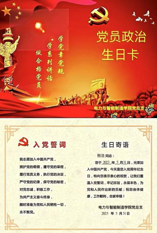 作為電力與智能制造學(xué)院云浮校區(qū)的一名教師黨員熊浩,2025年5月31日收到學(xué)院黨組織發(fā)的“政治生日”賀卡,我滿心歡喜,更懷著對組織深切關(guān)懷的感恩之情,迎來政治生日這一極具紀(jì)念意義的時刻——5月31日。于我而言,政治生日承載著對黨無限忠誠與堅定信念的莊重宣示。回首往昔,入黨時那火紅黨旗的鮮艷色彩,早已深深烙印在我內(nèi)心深處,成為永不褪色的精神底色;而那莊嚴(yán)的入黨誓詞,每一個字、每一句話,都已融入我的靈魂,化作前行的不竭動力。這力量,賦予鋼鐵般的黨性意志,讓我在黨的事業(yè)征程中,無畏艱難險阻,勇往直前。我愿將拼搏與奉獻(xiàn)當(dāng)作最質(zhì)樸的行動語言,在黨的工作中傾盡心力,不求回報,只盼為黨和人民的事業(yè)添磚加瓦,用一生踐行入黨時的錚錚誓言,不負(fù)組織的培養(yǎng)與期望。