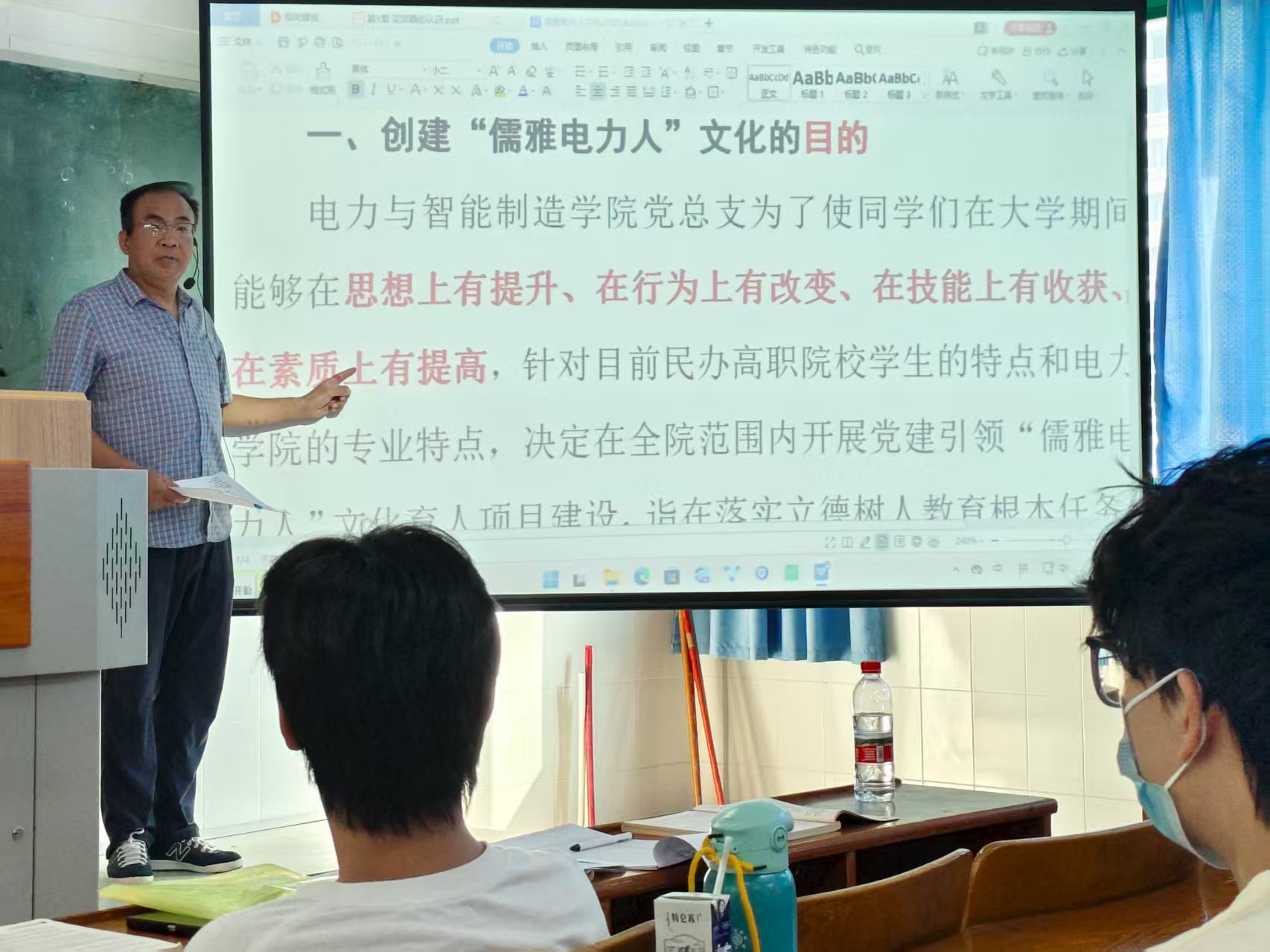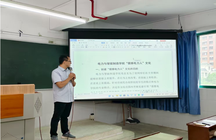 在“儒雅電力人”文化講解環(huán)節(jié),教師們結(jié)合學(xué)院發(fā)展歷程與各個(gè)專(zhuān)業(yè)行業(yè)特色,從“儒雅”的精神內(nèi)涵、行為準(zhǔn)則展開(kāi)闡述。引導(dǎo)學(xué)生理解“儒雅”不僅是外在言行的得體,更是內(nèi)在專(zhuān)業(yè)素養(yǎng)、責(zé)任擔(dān)當(dāng)?shù)捏w現(xiàn)。在實(shí)驗(yàn)室中嚴(yán)謹(jǐn)操作、在學(xué)習(xí)中謙遜求知、在未來(lái)工作中恪守行業(yè)規(guī)范,皆是“儒雅電力人”的生動(dòng)實(shí)踐。針對(duì)大一新生,教師重點(diǎn)講解文化認(rèn)知與角色轉(zhuǎn)變,幫助其建立學(xué)院歸屬感;對(duì)于大二,則結(jié)合專(zhuān)業(yè)學(xué)習(xí)進(jìn)度,強(qiáng)調(diào)將文化理念融入專(zhuān)業(yè)實(shí)踐。各位老師還為學(xué)生們講解了“三寶學(xué)風(fēng)”建設(shè)內(nèi)涵。“書(shū)、筆、本|”三件寶貝,作為學(xué)風(fēng)建設(shè)的核心載體,需要學(xué)生每節(jié)課都攜帶,方便記錄教師補(bǔ)充內(nèi)容和做作業(yè),這些都屬于學(xué)習(xí)態(tài)度的考核內(nèi)容。