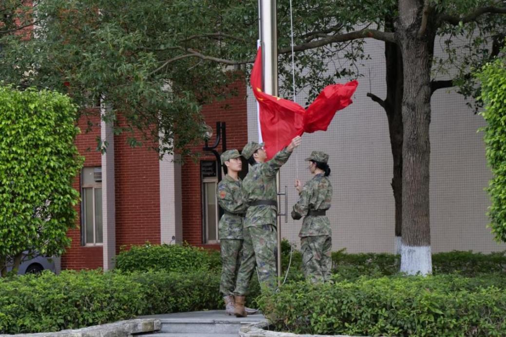 伴隨著雄壯的國歌聲,國旗冉冉升起,全體師生神情肅穆地面向國旗行注目禮,齊聲高唱國歌。