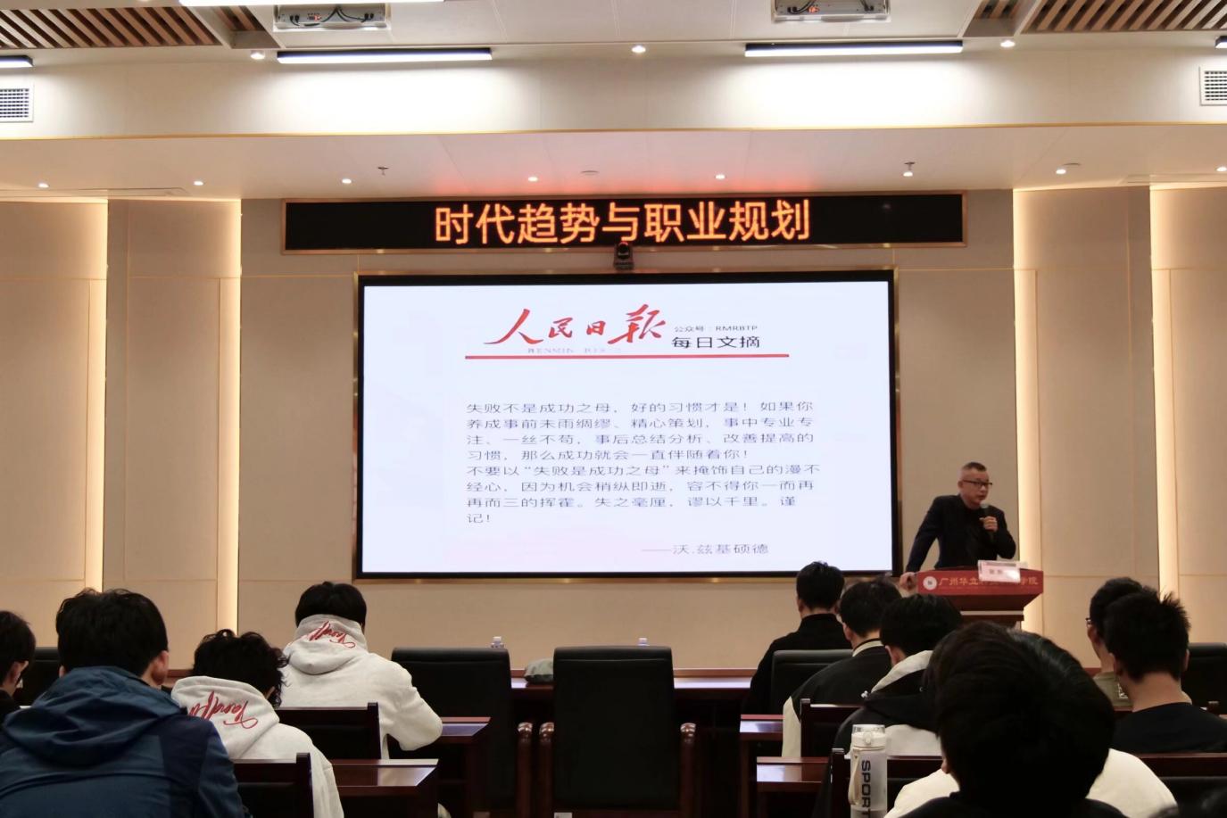 在解讀產(chǎn)業(yè)趨勢的同時,張董事長結(jié)合企業(yè)用人需求與行業(yè)變革現(xiàn)狀,重點分析了職業(yè)市場的潛在變化。他提到,隨著自動化、智能化技術(shù)在產(chǎn)業(yè)中的應用,出租車司機、代駕、傳統(tǒng)快遞及外賣配送等職業(yè)將面臨淘汰風險;公務(wù)員、教師、醫(yī)護等行業(yè)也將因技術(shù)賦能與人口結(jié)構(gòu)調(diào)整,迎來隊伍優(yōu)化與能力升級需求。針對這一趨勢,他從產(chǎn)教融合視角出發(fā),為學子們提出職業(yè)規(guī)劃“四大核心選擇”:一是錨定“對的賽道”,緊扣國家產(chǎn)業(yè)政策導向、技術(shù)發(fā)展趨勢與人口結(jié)構(gòu)變化,優(yōu)先選擇與戰(zhàn)略性新興產(chǎn)業(yè)、未來產(chǎn)業(yè)相關(guān)的領(lǐng)域;二是選準“對的平臺”,結(jié)合自身職業(yè)目標,權(quán)衡校企合作項目、實習實踐機會,在大企業(yè)的規(guī)范體系或中小企業(yè)的靈活空間中找到成長支點;三是結(jié)伴“對的伙伴”,在學習與實踐中主動鏈接行業(yè)導師、優(yōu)秀同窗,借助團隊力量提升綜合能力;四是堅持“持續(xù)學習”,緊跟產(chǎn)業(yè)技術(shù)更新節(jié)奏,通過校企聯(lián)合培訓、技能認證等方式,不斷迭代知識體系,適應產(chǎn)業(yè)發(fā)展需求。