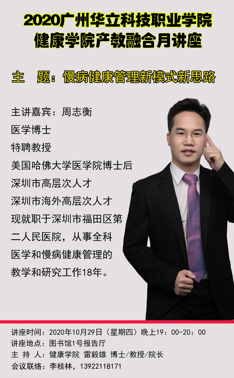 周志衡,全科醫(yī)學博士,美國哈佛醫(yī)學院博士后,深圳市高層次人才、深圳市海外高層次人才,副教授,碩士生導師,特聘教授,現(xiàn)就職于深圳市福田區(qū)第二人民醫(yī)院,從事全科醫(yī)學和慢病健康管理的教學和研究工作18年。近年主持國家自然科學基金2項、省市級科研項目30多項。參編全國統(tǒng)編教材10余部,發(fā)表論文近二百篇,其中SCI收錄十多篇。任《Cancer letter》、《Journal of medical internet research》、《Journal of Immunology Research》、《Journal of cancer》、《中華衛(wèi)生應急》、《中國全科醫(yī)學》和《中國職業(yè)醫(yī)學》等十余本雜志編委或特約審稿人。任國家自然科學基金一審專家、海峽兩岸醫(yī)藥衛(wèi)生交流協(xié)會全科醫(yī)學分會青年常委、廣東省基層衛(wèi)生協(xié)會常委、廣東省基層衛(wèi)生協(xié)會青骨干分會會長、廣東省臨床醫(yī)學學會全科醫(yī)學與基層衛(wèi)生專業(yè)委員會常委、廣東省醫(yī)師協(xié)會全科醫(yī)師分會委員、廣東省醫(yī)學會全科醫(yī)學分會委員、廣東省衛(wèi)生經(jīng)濟學會衛(wèi)生經(jīng)濟與文化專委會委員、廣州市摯友健康與藝術公益促進會副會長。