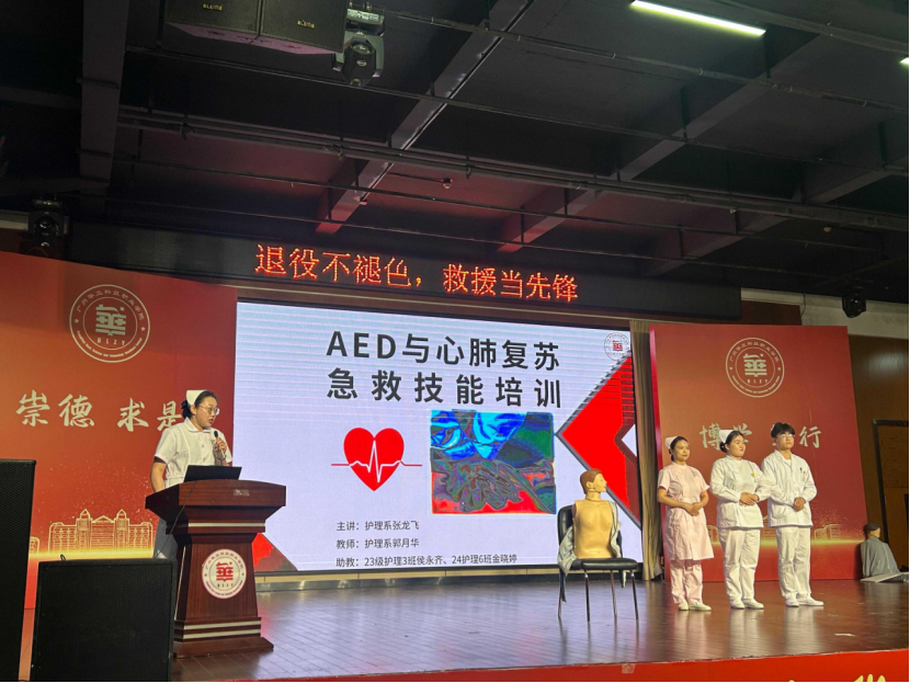 隨后,健康學(xué)院護(hù)理系教師張龍飛圍繞“認(rèn)識(shí)心臟驟停與‘黃金四分鐘’”這一主題,展開了系統(tǒng)而全面的講解。張老師結(jié)合生動(dòng)的實(shí)際案例,詳細(xì)剖析了心臟驟停的識(shí)別方法、應(yīng)急反應(yīng)系統(tǒng)的啟動(dòng)流程以及心肺復(fù)蘇(CPR)與自動(dòng)體外除顫器(AED)的正確使用方法。通過(guò)深入淺出的講解,讓在場(chǎng)師生對(duì)急救知識(shí)有了更為深刻、全面的認(rèn)識(shí)。