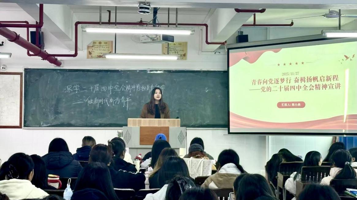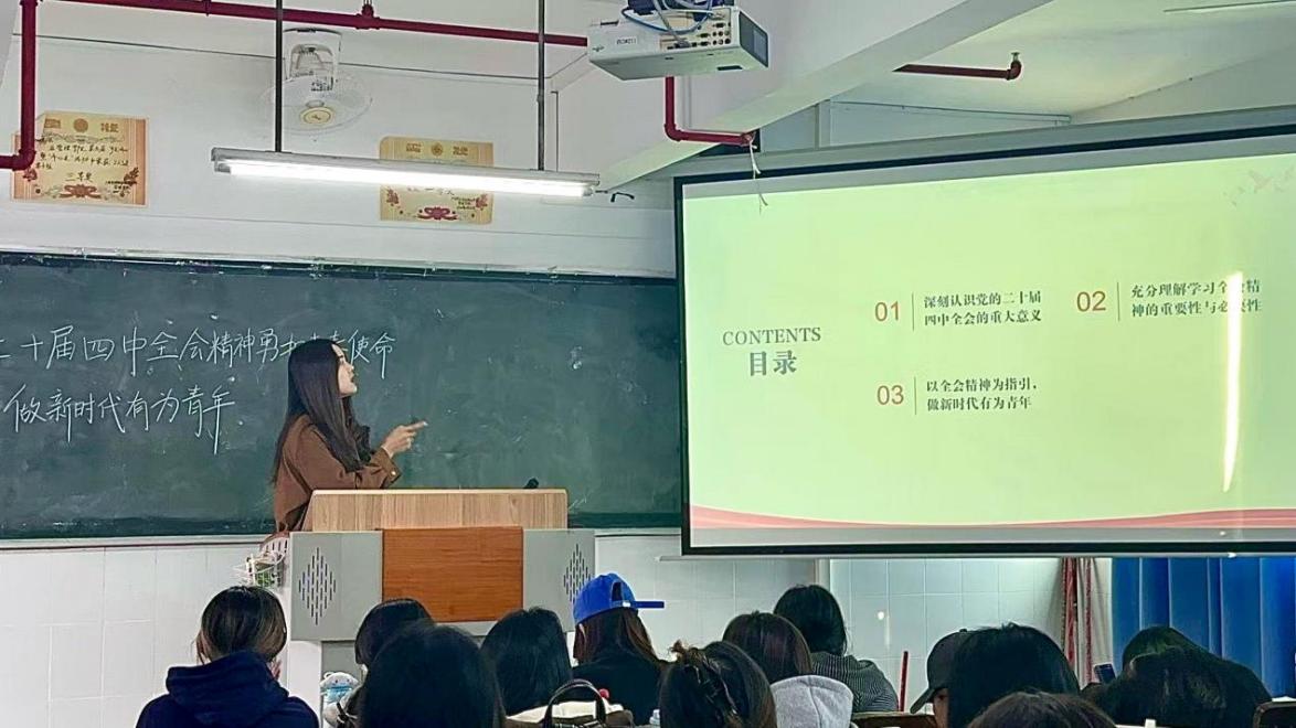 陳老師生動闡釋道:“黨的二十屆四中全會為國家發(fā)展擘畫了宏偉藍圖,更與我們每位青年學(xué)子的成長成才緊密相連?!彼貜娬{(diào),2025年是“十四五“ 收官與“十五五”謀劃的關(guān)鍵之年,深入學(xué)習(xí)全會精神,是青年學(xué)子認清時代方位、找準人生航向的 “必修課”,能幫助大家在專業(yè)學(xué)習(xí)與人生規(guī)劃中明確方向、積蓄奮進力量。