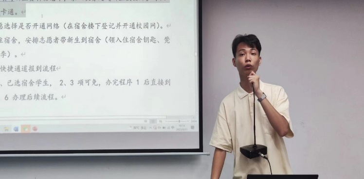 會(huì)議上計(jì)算機(jī)學(xué)院團(tuán)總支書記溫海浚老師為迎新志愿者們細(xì)致的講解了迎新工作流程