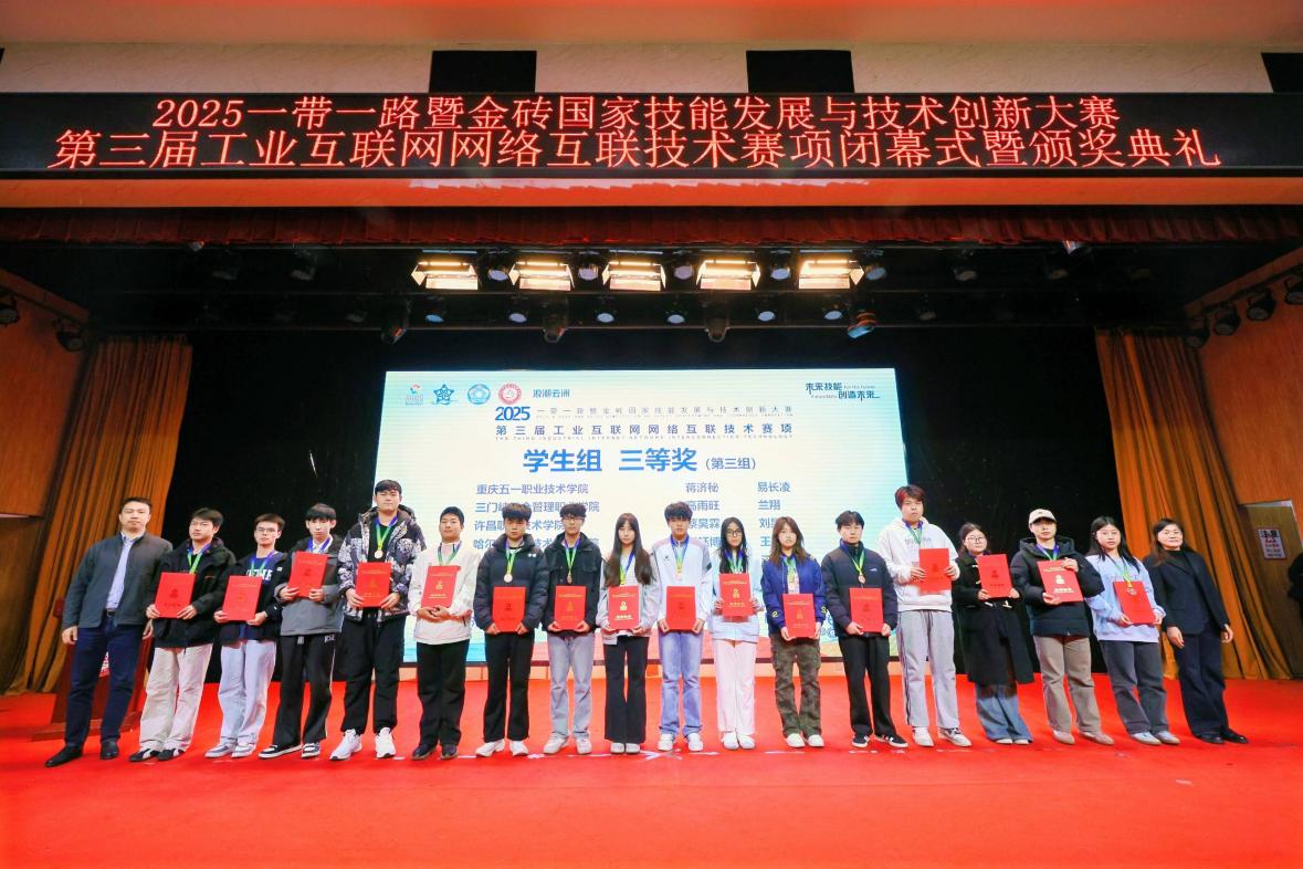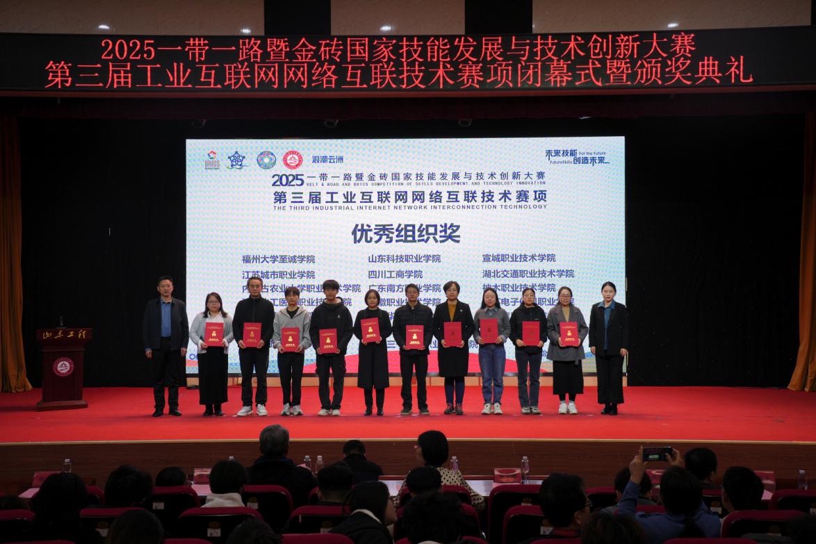 2025年11月7日-9日,2025年“一帶一路”暨金磚國(guó)家技能發(fā)展與技術(shù)創(chuàng)新大賽第三屆工業(yè)互聯(lián)網(wǎng)網(wǎng)絡(luò)互聯(lián)技術(shù)賽項(xiàng)全國(guó)總決賽在山東工程職業(yè)技術(shù)大學(xué)隆重舉行,吸引了來(lái)自全國(guó)81所院校的132支參賽隊(duì)伍同場(chǎng)競(jìng)技。我校計(jì)算機(jī)信息工程學(xué)院閔小翠、王建華老師指導(dǎo)選派的兩支代表隊(duì)(1隊(duì):馮俊杰,劉俊浩、2隊(duì):彭依琳,魏淙正),在全國(guó)總決賽賽場(chǎng)上,歷經(jīng)四小時(shí)的激烈比拼,最終憑借扎實(shí)的專業(yè)知識(shí)、科學(xué)的團(tuán)隊(duì)協(xié)作,最終脫穎而出,榮獲全國(guó)總決賽二等獎(jiǎng)1項(xiàng)、三等獎(jiǎng)1項(xiàng),為學(xué)校贏得榮譽(yù)。我校榮獲“優(yōu)秀組織獎(jiǎng)”、兩位指導(dǎo)教師榮獲“優(yōu)秀指導(dǎo)教師”稱號(hào)。