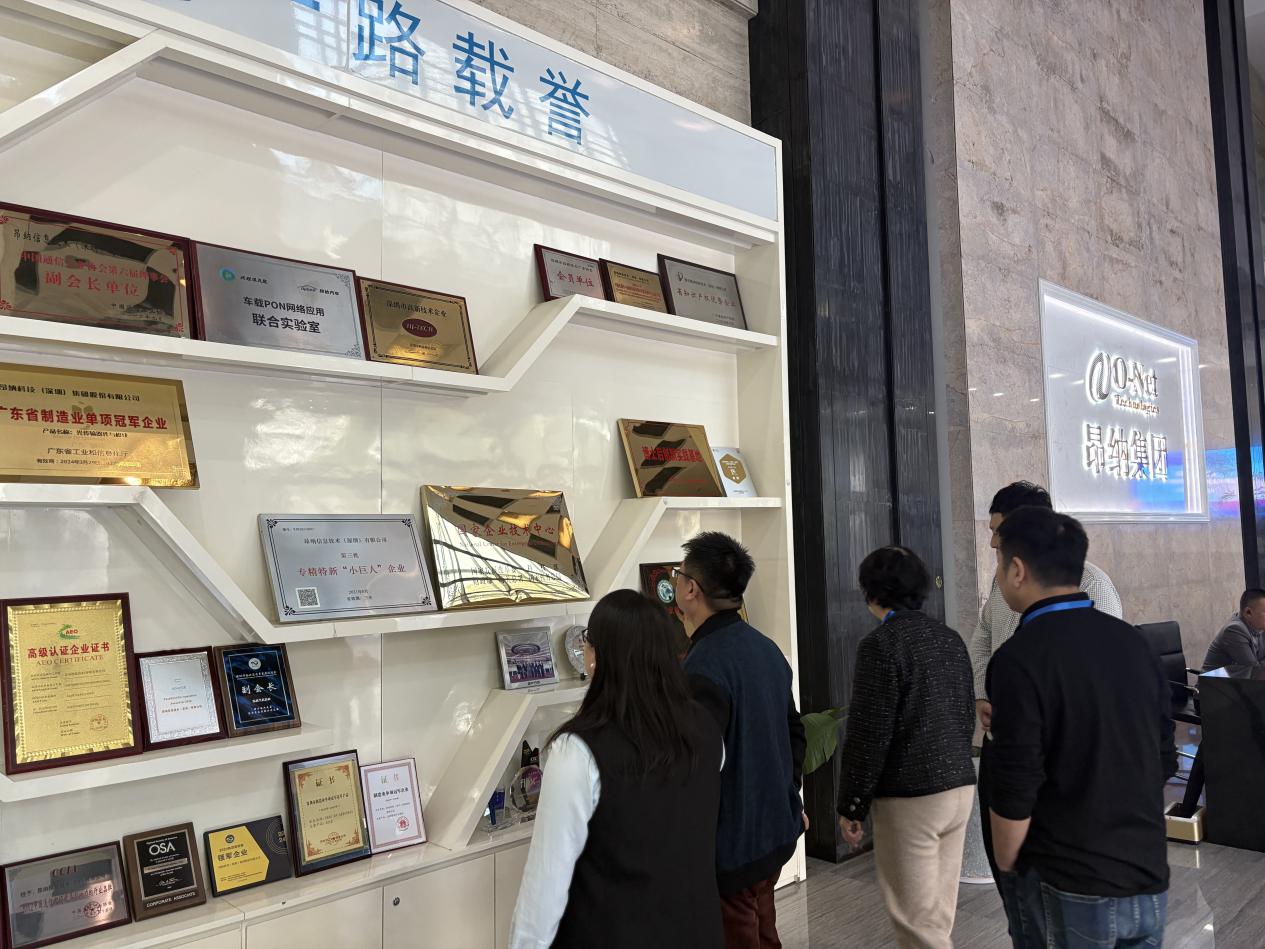 交流首站,學院領導參觀了企業(yè)榮譽展示區(qū):陳列的“廣東省制造業(yè)單項冠軍企業(yè)”等資質牌匾、合作榮譽,直觀展現了昂納在信息技術領域的行業(yè)影響力,也為雙方后續(xù)溝通鋪墊了產業(yè)實力認知基礎。
