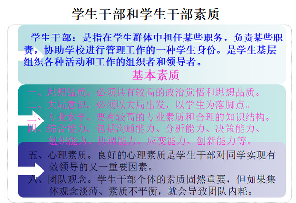 第二講由鄭慶國(guó)老師授之“學(xué)生干部的素質(zhì)培養(yǎng)及領(lǐng)導(dǎo)力提升”課程。首先,鄭慶國(guó)老師強(qiáng)調(diào)作為一名學(xué)生干部的基本素質(zhì)和應(yīng)盡的職責(zé)。接著指出,應(yīng)該做到學(xué)習(xí)工作兩不誤,合理的安排兩者之間的時(shí)間。隨后講到作為學(xué)生干部應(yīng)該如何工作更加的合理和學(xué)生干部應(yīng)該怎么做做出了要求。最后,鄭慶國(guó)老師提醒學(xué)生干部現(xiàn)在應(yīng)該要做的三件事情,分別是:行動(dòng),規(guī)劃和調(diào)整。目的是讓學(xué)生干部在大學(xué)生活里不要迷茫,讓學(xué)生干部要明確自己的目標(biāo)和計(jì)劃,有了計(jì)劃就要付出行動(dòng),這樣的大學(xué)生活才不會(huì)迷茫,才有方向。