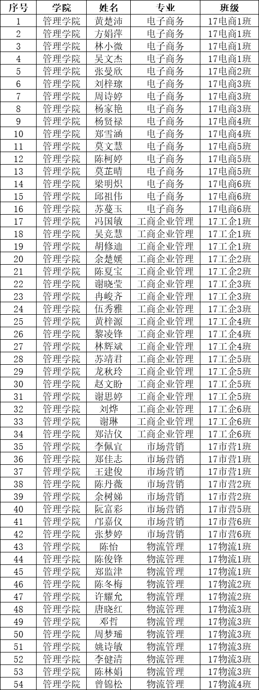 根據(jù)廣州華立科技職業(yè)學(xué)院下發(fā)《華立職院學(xué)〔2020〕21號關(guān)于評選2020屆優(yōu)秀畢業(yè)生的通知》,為表彰先進(jìn),進(jìn)一步調(diào)動廣大同學(xué)們學(xué)習(xí)、就業(yè)的積極性,激發(fā)同學(xué)們奮發(fā)向上,創(chuàng)建良好的學(xué)風(fēng)校風(fēng),在就業(yè)創(chuàng)業(yè)中努力進(jìn)取,管理學(xué)院應(yīng)學(xué)校要求在2020屆畢業(yè)生中開展評選優(yōu)秀畢業(yè)生的活動。經(jīng)個人申請,管理學(xué)院輔導(dǎo)員、校外實習(xí)指導(dǎo)老師共同推薦,學(xué)院領(lǐng)導(dǎo)審核,我學(xué)院擬將推薦黃楚沛等54位同學(xué)為2020屆優(yōu)秀畢業(yè)生?,F(xiàn)將2020屆優(yōu)秀畢業(yè)生的名單公示如下(具體名單見下表):
