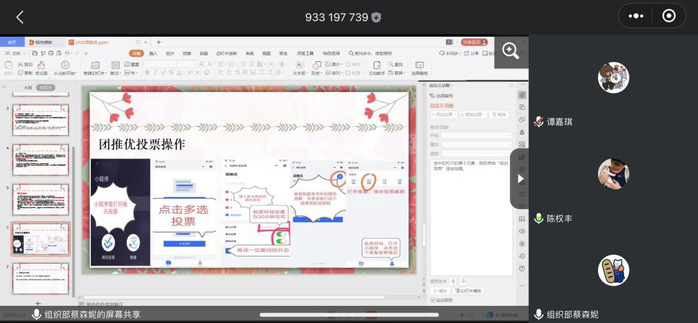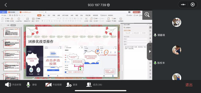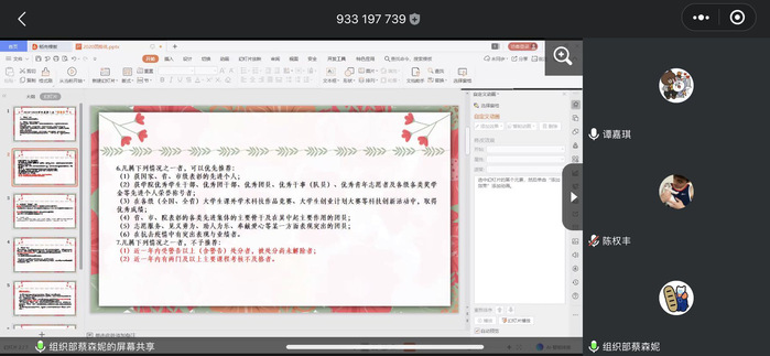 國貿(mào)學(xué)院團(tuán)總支學(xué)生會(huì)組織部部長蔡森妮同學(xué)詳細(xì)向18、19級團(tuán)支書介紹了有關(guān)團(tuán)推優(yōu)需要注意的事項(xiàng):一、本次團(tuán)推優(yōu)對象為我校在讀的18、19級團(tuán)員,參與團(tuán)推優(yōu)者需要符合團(tuán)推優(yōu)的基本條件才可進(jìn)行團(tuán)推優(yōu)。二、各個(gè)團(tuán)支部有一定的團(tuán)推優(yōu)人數(shù),在團(tuán)推優(yōu)過程中要公平公正不能出現(xiàn)包庇、爭鋒相對的現(xiàn)象。三、團(tuán)推優(yōu)和團(tuán)支部大會(huì)的程序:由于疫情影響,今年的團(tuán)推優(yōu)程序在線上開展,由團(tuán)支部召開支部團(tuán)員大會(huì)。