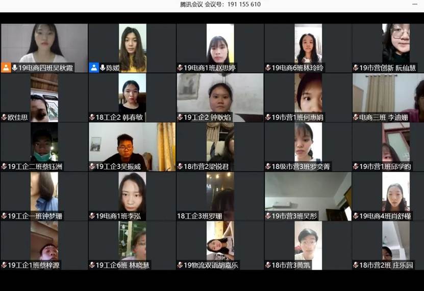 頒獎大會于2020年6月3日晚上7點(diǎn)30分在騰訊會議上舉行。參加人員:管理學(xué)院團(tuán)總支書記陳媛老師、團(tuán)總支書記助理莫佩珊同學(xué)、團(tuán)總支常務(wù)副書記丁偉金同學(xué)、學(xué)生會主席黃天龍同學(xué)、學(xué)生會副主席陳嘉琪同學(xué)以及管理學(xué)院18、19級活動參賽同學(xué)、主持人吳秋霞同學(xué)。
