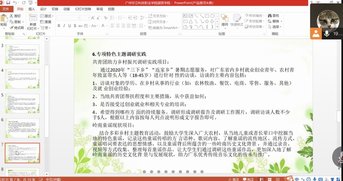 接著,談到專項(xiàng)特色主題調(diào)研實(shí)踐。分別是共青團(tuán)助力鄉(xiāng)村振興調(diào)研實(shí)踐項(xiàng)目和嶺南童謠現(xiàn)狀項(xiàng)目;共青團(tuán)助力鄉(xiāng)村振興調(diào)研實(shí)踐項(xiàng)目通過2020年“三下鄉(xiāng)”“返家鄉(xiāng)”暑假志愿服務(wù)。對(duì)廣東省內(nèi)鄉(xiāng)村就業(yè)創(chuàng)業(yè)青年、農(nóng)村青年致富帶頭人等進(jìn)行針對(duì)性的訪談。嶺南童謠現(xiàn)狀項(xiàng)目是結(jié)合多彩鄉(xiāng)村為主題的教育活動(dòng),鼓勵(lì)大學(xué)生深入廣大農(nóng)村,從當(dāng)?shù)貎和蛘唛L輩口中挖掘當(dāng)?shù)氐奶厣{,讓大學(xué)生通過調(diào)研童謠作品,更加深入地了解嶺南童謠的歷史文化背景與發(fā)展現(xiàn)狀。