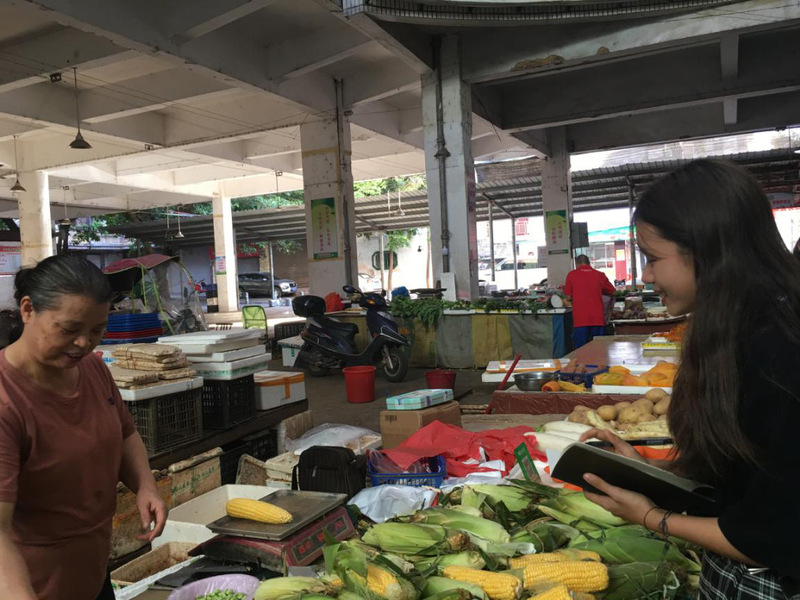 8月18日,位于粵北地區(qū)廣東省南雄市的同學也開始他們的工作,他們?nèi)サ搅水數(shù)氐囊粋€農(nóng)貿(mào)市場。通過對菜攤、雜貨鋪等老板交談中了解到當?shù)氐奶厣似泛酮氂刑厣?,也看到了當?shù)厝嗣駥ι畹臒釔?/span>。在市場中人們沒有借助任何的工具設(shè)備的交談,直接的人與人的溝通。