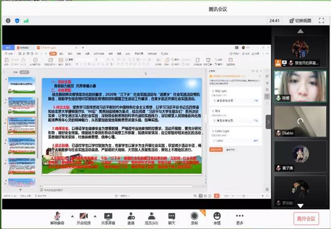 2020年7月25日晚上7點,管理學院于線上騰訊會議開展“三下鄉(xiāng)”社會實踐活動。參加本次會議的領導與嘉賓有:管理學院學生管理唐濤副主任、團總支書記陳媛老師、管理學院新一屆主席團、19級團總支學生會參會學生、19級班長、團支書。