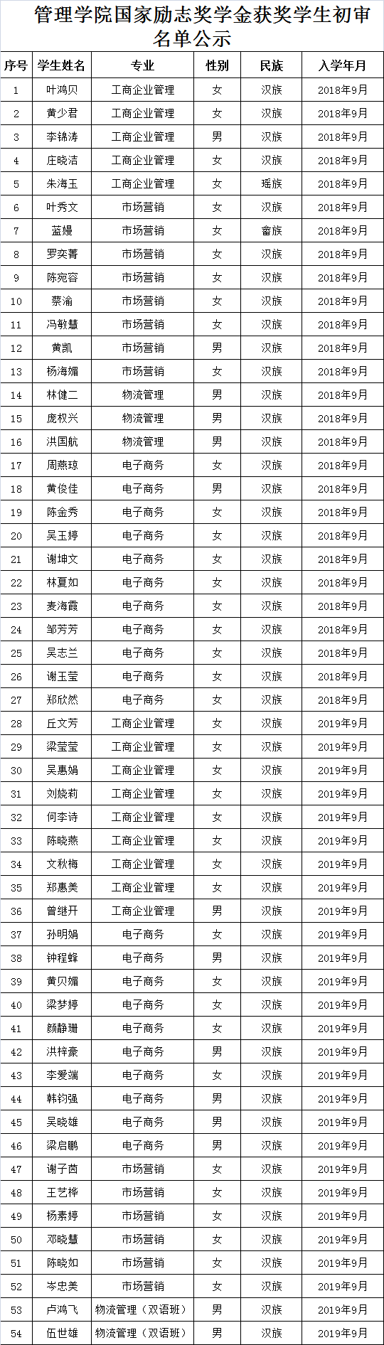 根據(jù)《關(guān)于做好我校2020學(xué)年國(guó)家獎(jiǎng)助學(xué)金評(píng)審的通知》文件的有關(guān)要求,經(jīng)學(xué)生本人申請(qǐng),各班級(jí)民主評(píng)議,學(xué)院評(píng)定小組審核,我學(xué)院擬推薦葉鴻貝等54位同學(xué)為2019-2020學(xué)年度國(guó)家勵(lì)志獎(jiǎng)學(xué)金獲獎(jiǎng)學(xué)生。按照公開、公平、公正的原則,現(xiàn)將推薦名單予以公示,公示期為2020年10月2日-10月6日,如有異議,請(qǐng)?jiān)诠酒趦?nèi)進(jìn)行反映。