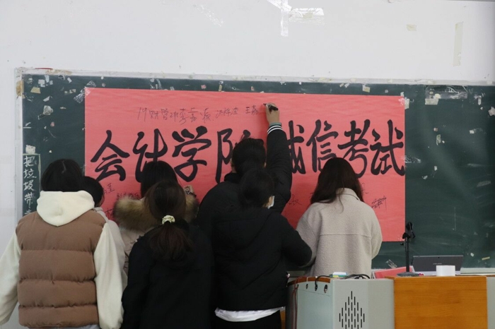 會議最后舉行了承諾誠信應(yīng)考簽名儀式,學(xué)生會各部門代表以及班級代表都在簽名墻上,寫下了自己的名字,承諾以實力爭取優(yōu)異成績,以誠信展現(xiàn)良好的學(xué)風(fēng),認(rèn)真復(fù)習(xí),堅決杜絕考試作弊行為。
