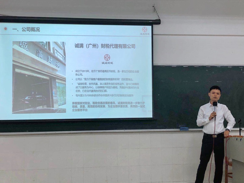 宣講會上,廣州華務財稅咨詢公司總經(jīng)理陳鵬通過PPT展示,對企業(yè)的基本情況、企業(yè)文化、發(fā)展歷程、發(fā)展整體目標、崗位招聘信息以及員工福利薪酬等,分別進行了詳細的介紹。