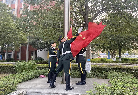 由主持人宣布升旗儀式正式開始,國旗護衛(wèi)隊成員邁著鏗鏘有力的步伐來到了國旗臺下,伴隨著莊嚴嘹亮的國歌聲,鮮艷的五星紅旗冉冉升起,迎著朝陽隨風飄揚,全體師生行注目禮。
