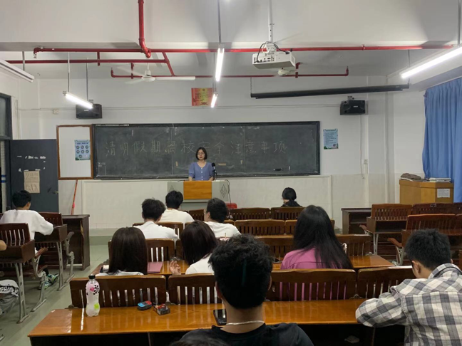 班會上,李明鈺老師告知同學們我校將與其他學校錯峰放假,叮囑同學們在放假前的課程也要按時上課,不無故曠課,不遲到,不早退,同時還提醒同學們按時返校,并提前訂好返校車票。其次,提醒回家的同學們假期期間注意安全,掃墓祭祖時小心明火,避免火災等安全隱患發(fā)生;天氣潮濕要注意房屋通風,避免病菌增生;留校的同學們要注意安全,按門禁時間回到宿舍,不要晚歸;所有同學注意疫情防控期間,出門帶好口罩,注意個人衛(wèi)生,勤洗手,注意消毒,提高自我防疫意識。