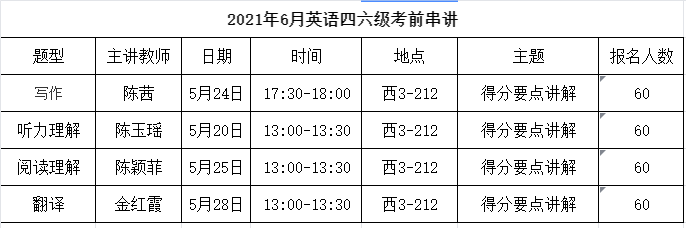 為提升2019級、2020級在校學生2021年6月全國英語四六級考試成績,國際經(jīng)濟與外語學院教師將針對考試模塊進行考前串講,具體安排如下: