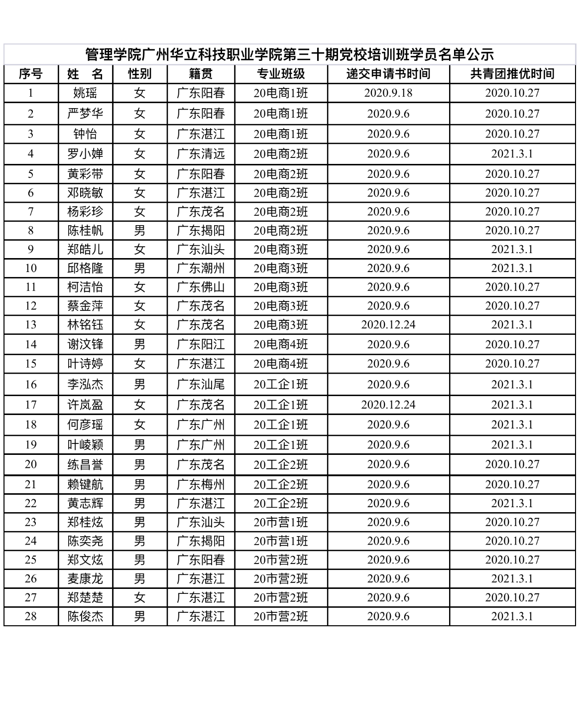凡對確定以下同學(xué)為第30期黨校培訓(xùn)班學(xué)員有意見及異議者,請在公示期內(nèi)以書面形式向管理學(xué)院黨總支或校黨委辦公室反映。
