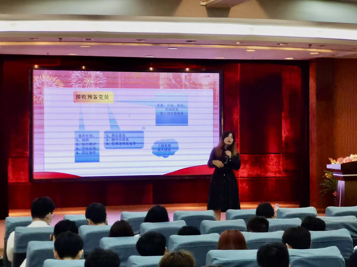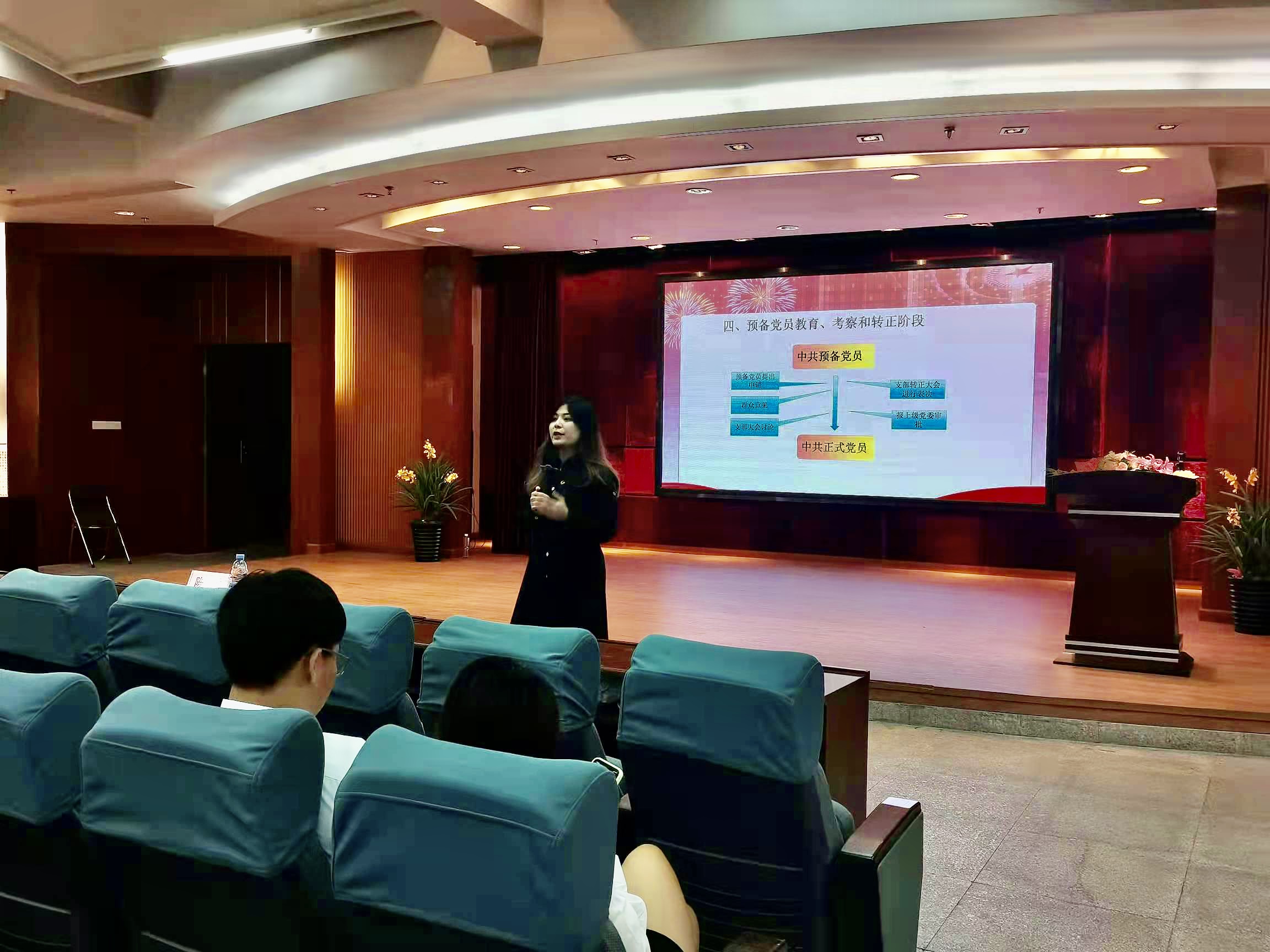 由第二黨支部組織(宣傳)委員陳媛同志講解發(fā)展黨員階段的五個(gè)流程:申請入黨階段,積極分子階段,發(fā)展對象階段,吸收為預(yù)備黨員階段,正式黨員階段。其中在申請入黨階段,她特別強(qiáng)調(diào)入黨的同志需自愿提出入黨申請,并上交入黨申請書,期間可以先了解入黨的流程和要求。同時(shí)鼓勵(lì)申請入黨的青年團(tuán)員積極參加黨校培訓(xùn),通過黨校培訓(xùn)端正入黨動(dòng)機(jī),提高理論基礎(chǔ)。