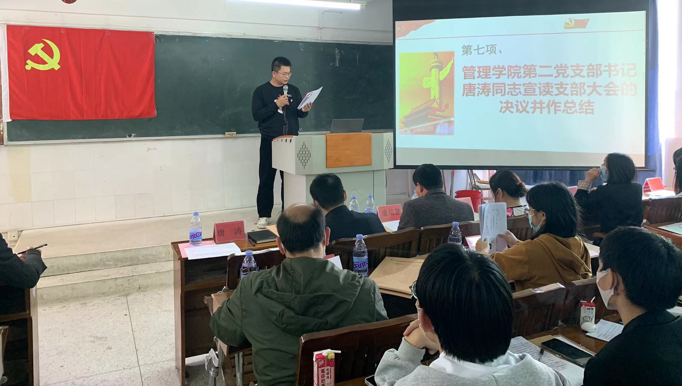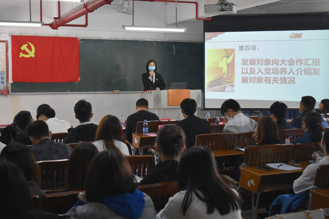 管理學(xué)院第二黨支部于2021年12月8日于西三312教室召開一次支部大會,主要議題是討論接收賴水銀等24位同志加入中國共產(chǎn)黨事宜。按照發(fā)展黨員工作相關(guān)要求,本次24名發(fā)展對象經(jīng)過支部一年以上的培養(yǎng)考察,履行政審、公示、集中培訓(xùn)和黨委預(yù)審等程序后,現(xiàn)提交支部大會討論、表決是否接收為預(yù)備黨員。本次的參會人員有:管理學(xué)院黨總支書記郭仲先同志、管理學(xué)院黨總支副書記(二支部書記)唐濤同志、管理學(xué)院第一黨支部書記康信恩同志、管理學(xué)院第二黨支部組織(宣傳)委員陳媛同志、管理學(xué)院第二黨支部紀(jì)檢委員戴雙雅同志、全體教師黨員、學(xué)生黨員和黨建小組成員。