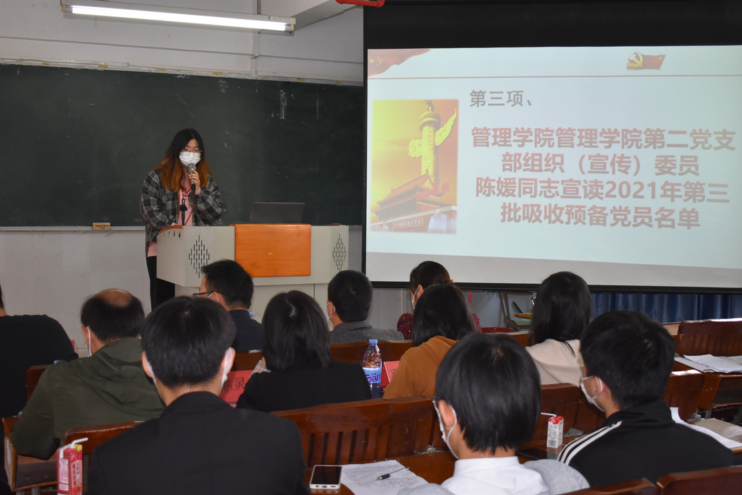 由管理學(xué)院第二黨支部組織(宣傳)委員陳媛同志宣讀2021年第三批吸收預(yù)備黨員名單。