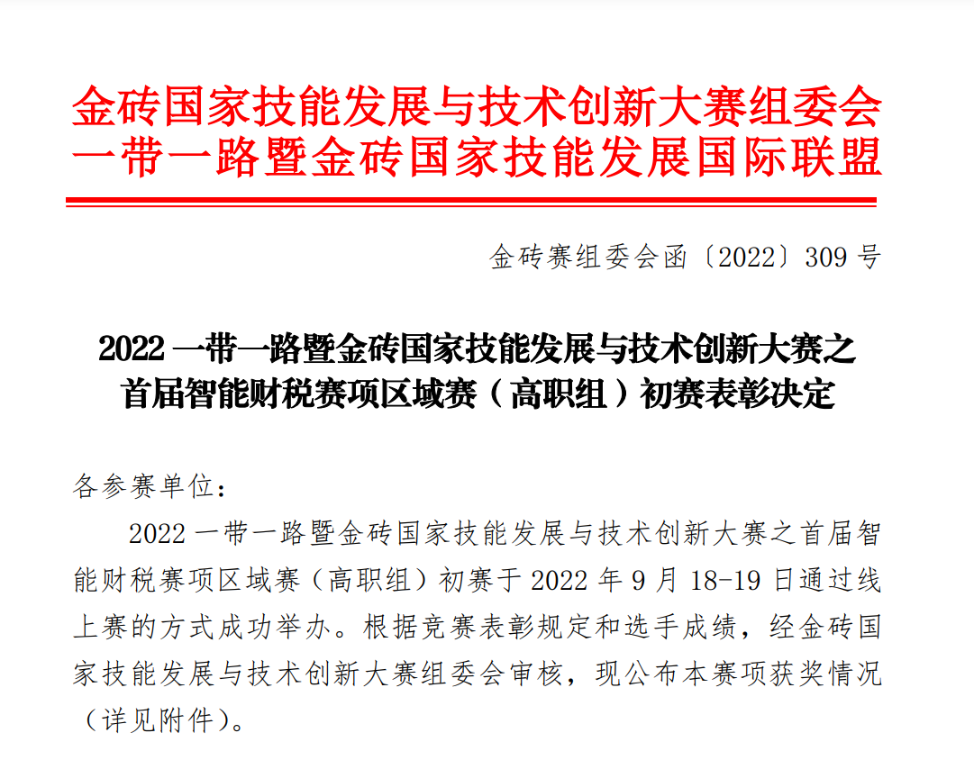 2022年9月18日,由金磚國家工商理事會、一帶一路暨金磚國家技能發(fā)展國際聯(lián)盟主辦的2022一帶一路暨金磚國家技能發(fā)展與技術(shù)創(chuàng)新大賽之智能財稅賽項(高職組)初賽在云端舉行,我校財經(jīng)學(xué)院20級大數(shù)據(jù)與會計(3+2)2班李宇、蔡依恂、林佑儒和李雪瑩組成的華立職院1隊(指導(dǎo)老師:何玉冰、馬瑞華)獲得國賽三等獎,;21級大數(shù)據(jù)與會計班朱潔茹、李柳嬋、鄭佳欣和詹鳳嬉組成的華立職院2隊(指導(dǎo)老師:王赟、歐陽偉籌)獲得國賽優(yōu)秀獎。