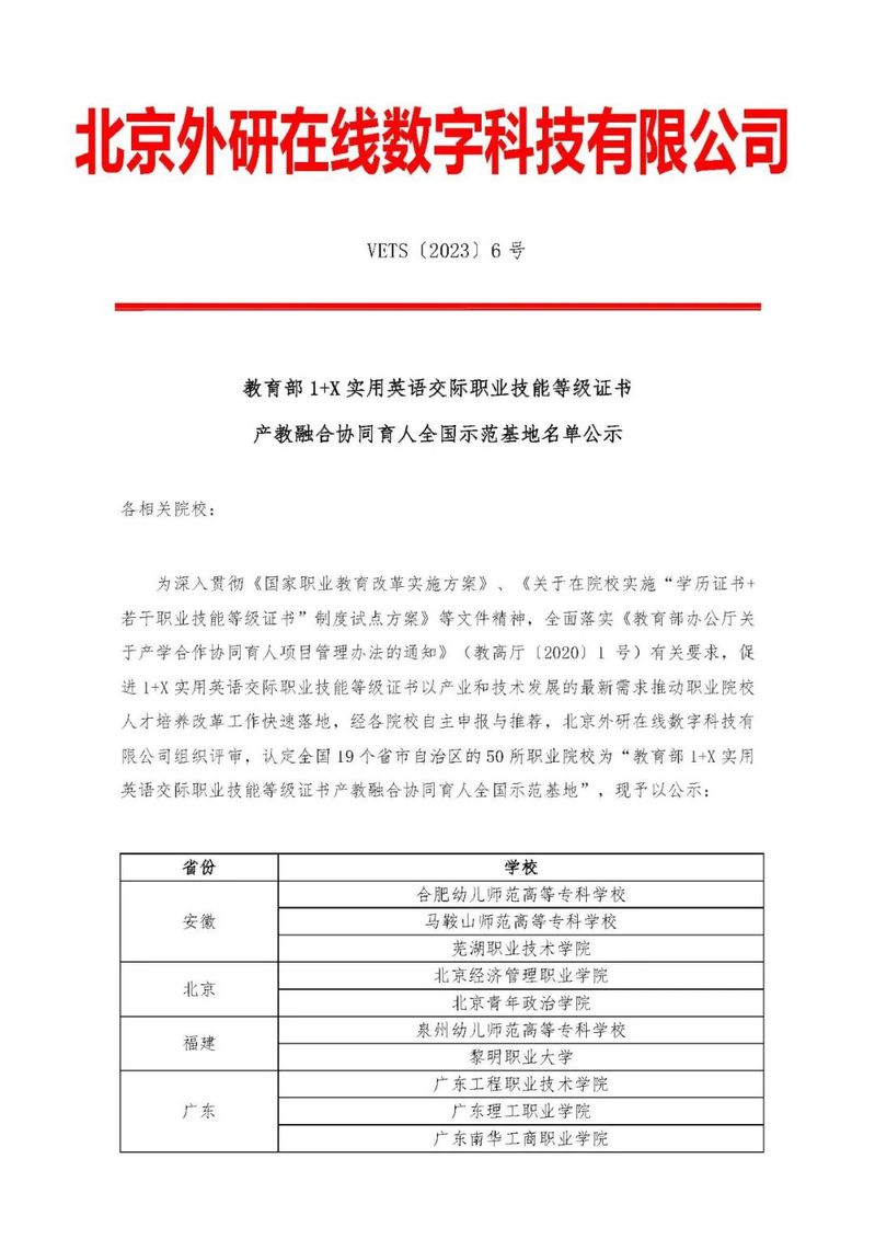 為建設(shè)培育具有示范引領(lǐng)效應(yīng)的產(chǎn)教融合平臺(tái)和協(xié)同育人基地,結(jié)合教育部1+X證書(shū)最新要求,全方位推動(dòng)職業(yè)外語(yǔ)教育高質(zhì)量發(fā)展,我院商務(wù)英語(yǔ)系主任謝慧琪老師主持申報(bào),廣州校區(qū)與云浮校區(qū)商務(wù)英語(yǔ)系的教師團(tuán)隊(duì)共同努力,項(xiàng)目于2023年申報(bào)“教育部1+X實(shí)用英語(yǔ)交際職業(yè)技能等級(jí)證書(shū)(簡(jiǎn)稱(chēng)VETS)產(chǎn)教融合協(xié)同育人全國(guó)示范基地成功!項(xiàng)目成功獲批來(lái)之不易,它充分體現(xiàn)“崗課賽證”改革研究與實(shí)踐、產(chǎn)教融合協(xié)同育人模式、“雙師型”師資隊(duì)伍建設(shè)等方面領(lǐng)航VETS體系特色。我校于2022年下半年公布《關(guān)于修訂2022級(jí)專(zhuān)業(yè)人才培養(yǎng)方案的指導(dǎo)意見(jiàn)》文件,對(duì)培養(yǎng)目標(biāo)與基本要求,明確規(guī)定推行“學(xué)歷證書(shū)+若干職業(yè)技能等級(jí)證書(shū)”(1+X)和“學(xué)歷證書(shū)+職業(yè)資格證書(shū)”(雙證書(shū))的制度,為職教改革和職業(yè)技能人才培養(yǎng)提供政策支持和方向指引。