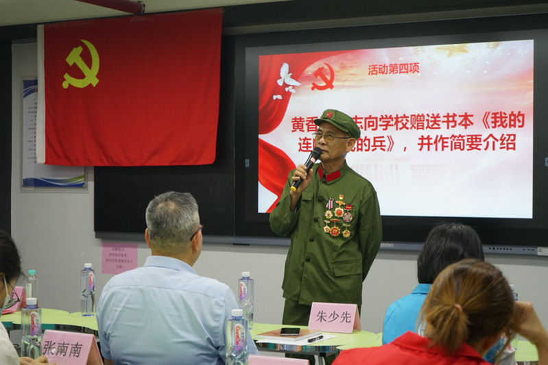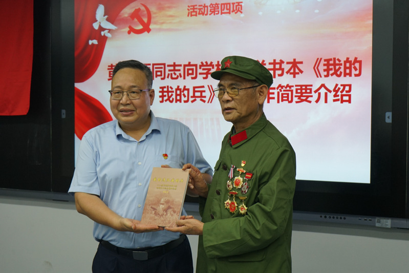 接著,黃香源同志向學(xué)院黨組織贈送自傳體戰(zhàn)斗回憶錄《我的連隊(duì),我的兵》,并作簡要介紹。黃老用樸素的語言介紹了他在對越自衛(wèi)還擊戰(zhàn)中英勇奮戰(zhàn)保家衛(wèi)國,不顧危險(xiǎn)帶領(lǐng)指揮“老虎尖刀連”出色完成作戰(zhàn)任務(wù)的傳奇故事,顧老在那場戰(zhàn)斗中挺身而出排除地雷陣,并將排出的地雷巧妙布防在我方防御陣地減少我方犧牲,為大部隊(duì)沖上山峰奪取勝利作出了重大貢獻(xiàn),最后榮獲一等戰(zhàn)功。