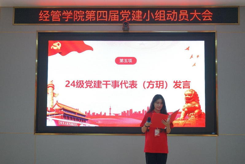 24級黨建干事代表方玥同學發(fā)言。她表示,新一屆黨建小組將始終把政治理論和業(yè)務知識學習作為必修課,創(chuàng)新學習方式,提高學習效果,以飽滿的熱情投入到工作中去,為學院黨建工作助力,積極參加各種活動,大家互幫互助,共同進步,提升服務師生的能力。