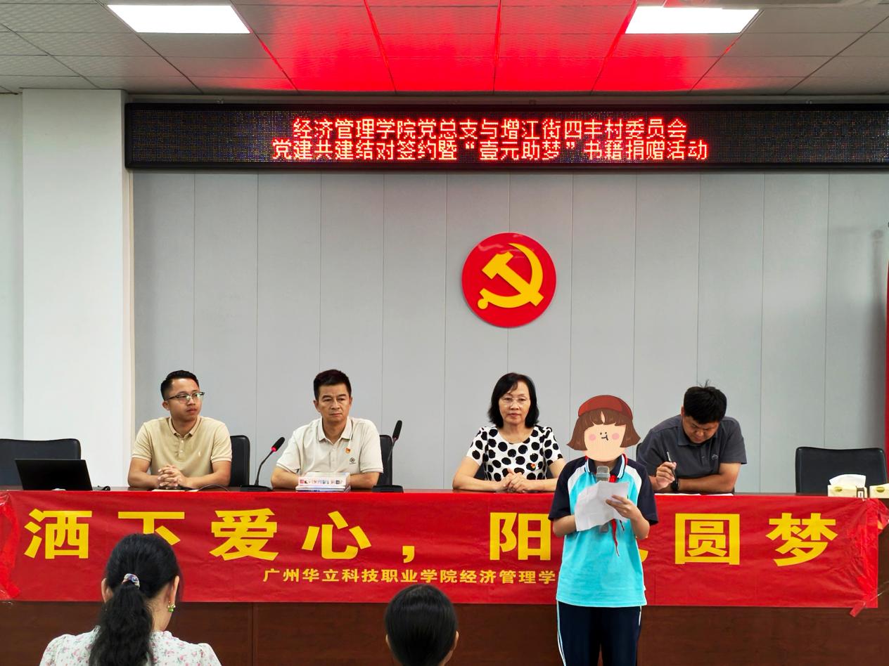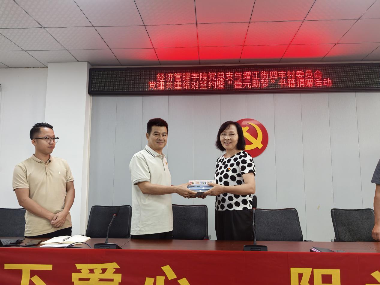 為弘揚奉獻(xiàn)精神,傳遞知識力量,助力夢想起航,6月30日,經(jīng)濟(jì)管理學(xué)院黨總支在四豐村黨群服務(wù)中心開展“壹元助夢”愛心書籍捐贈活動。經(jīng)濟(jì)管理學(xué)院黨總支書記、院長劉惠玲,副院長朱向平,四豐村黨支部書記陳耀堅、四豐小學(xué)校長陳遠(yuǎn)球及村民代表、師生代表共同出席了活動。