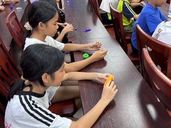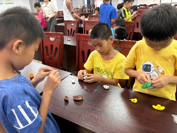 粘土元寶制作環(huán)節(jié)則充滿了歡聲笑語。隊員們帶來了五顏六色的粘土,手把手地教小朋友們制作粘土元寶。大家圍坐在一起,跟著大學生們的步驟,揉、捏、搓,不一會兒,一個個形態(tài)各異的粘土元寶就制作完成了。有的小朋友還發(fā)揮自己的想象,在元寶上加上了一些具有鄉(xiāng)村特色的裝飾。